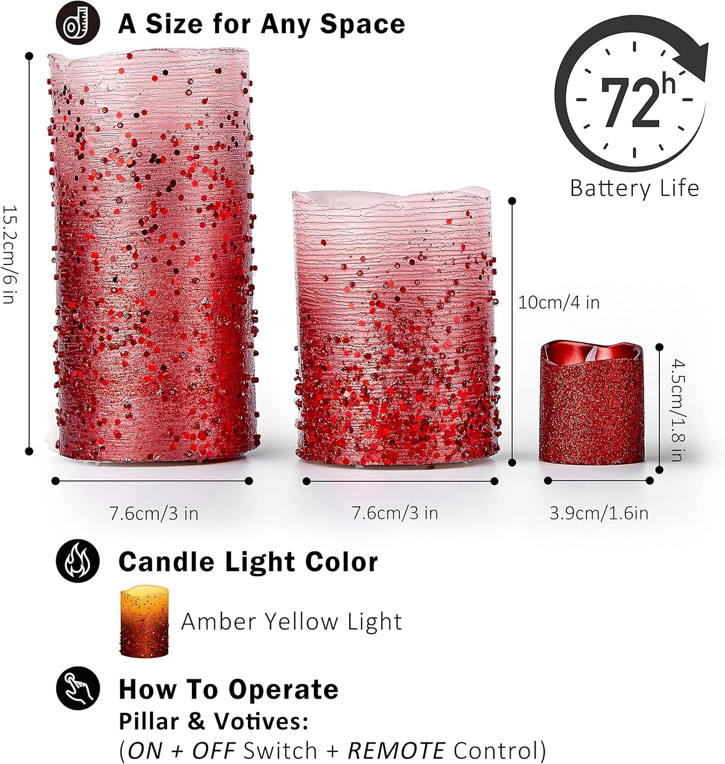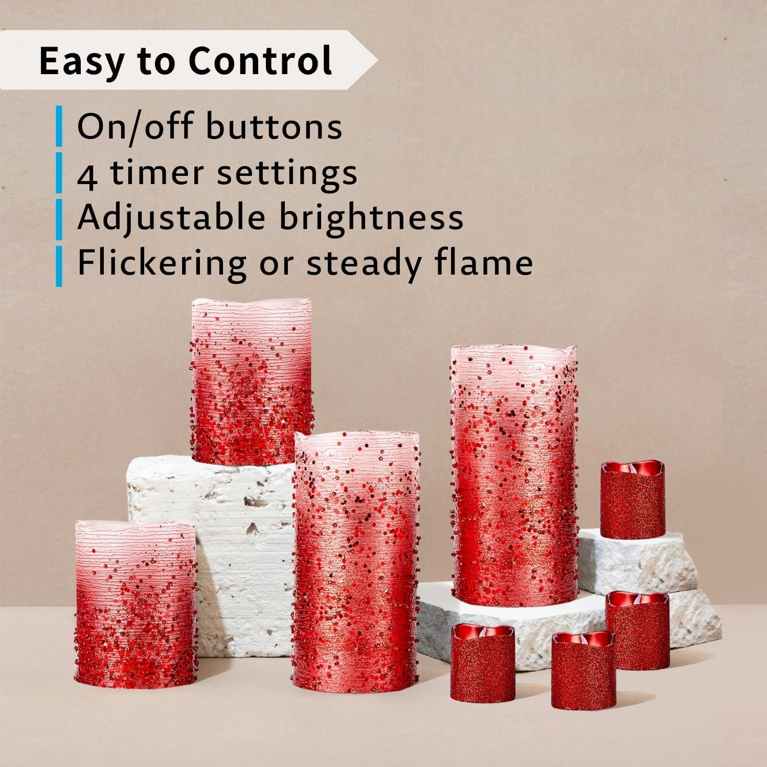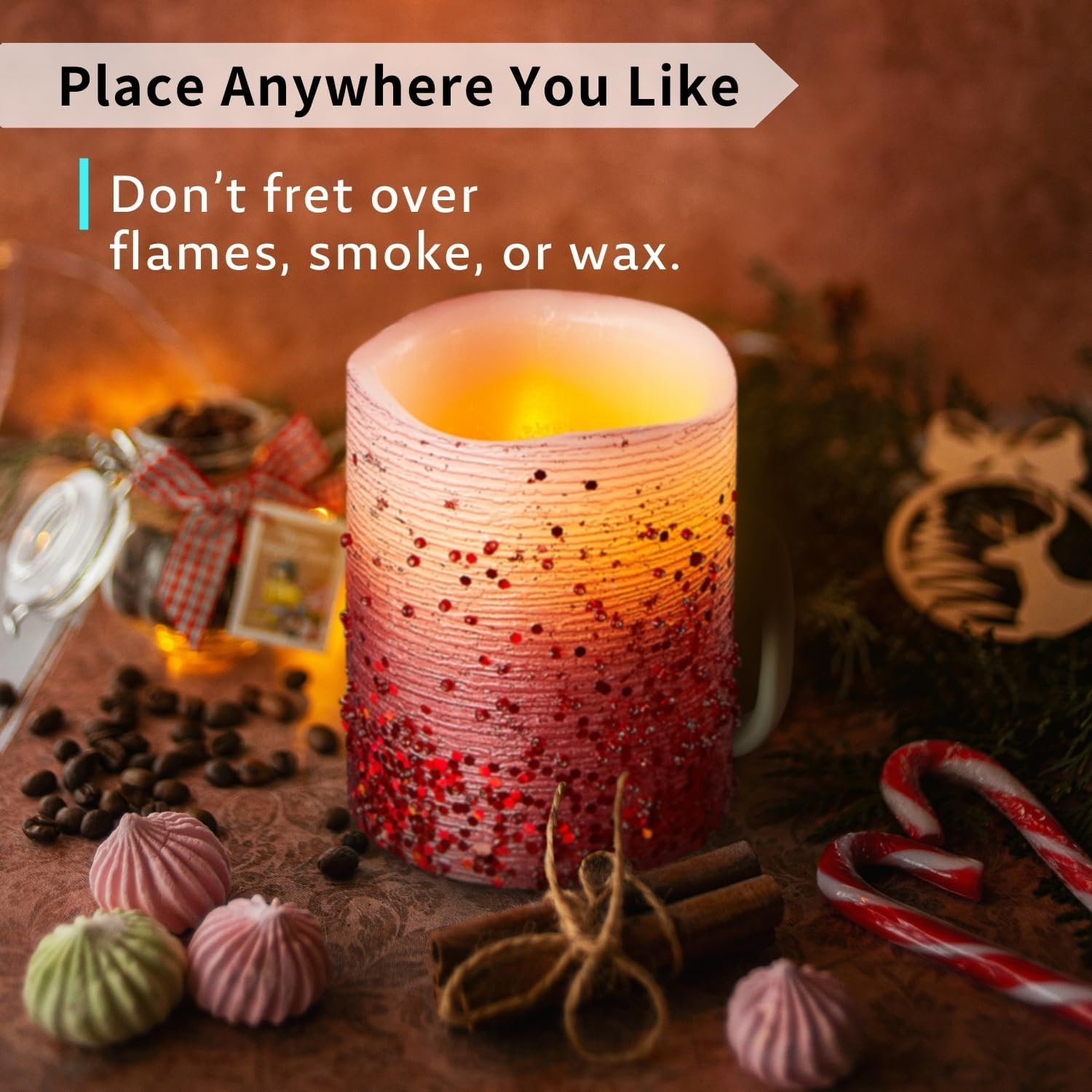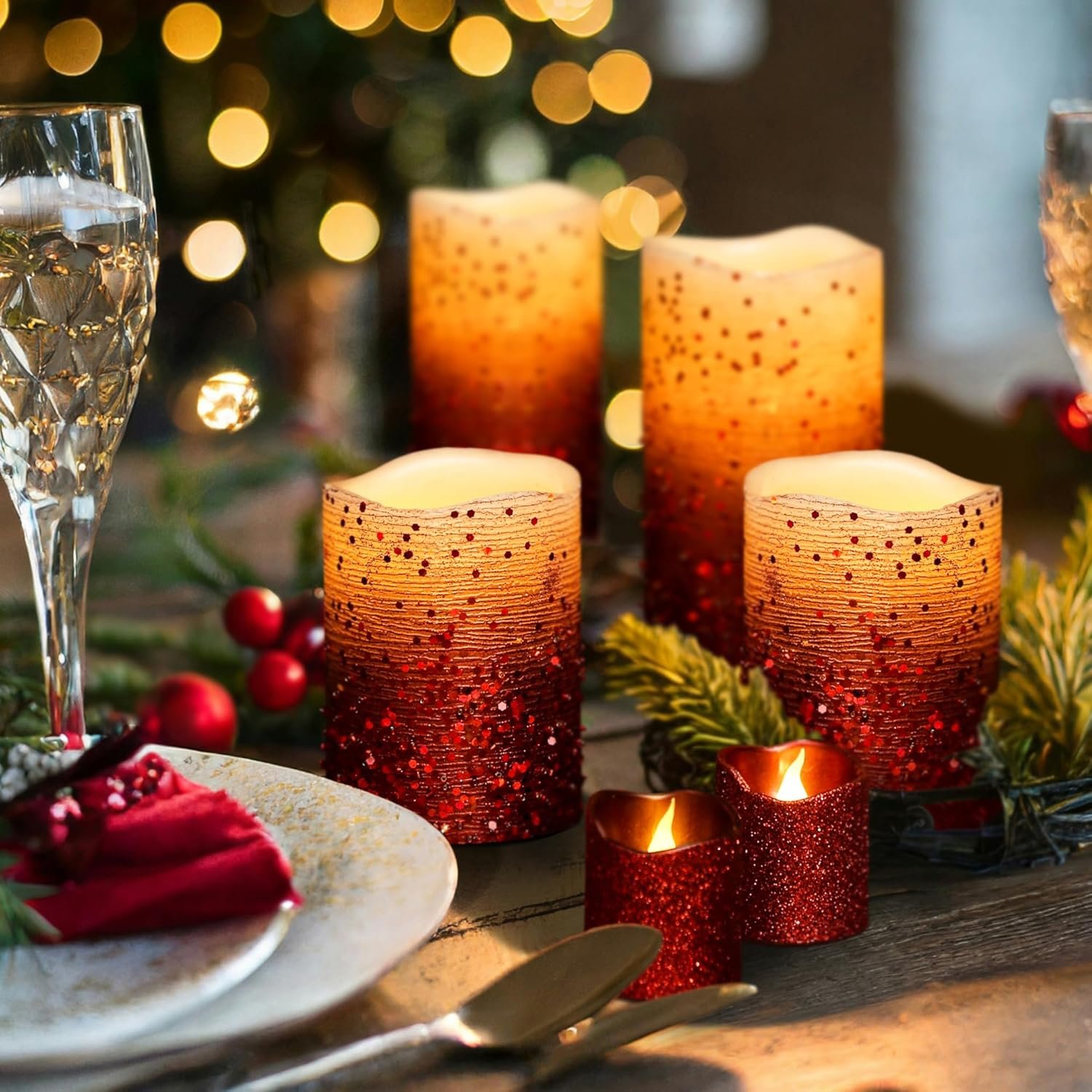 🕯️ Safe for Kids and Pets: Instantly create a festive, cozy mood with our glitter LED candles in Gold, Red, Silver, White, and Rose Gold. No flame, no mess—just warm candlelight to enhance any décor.