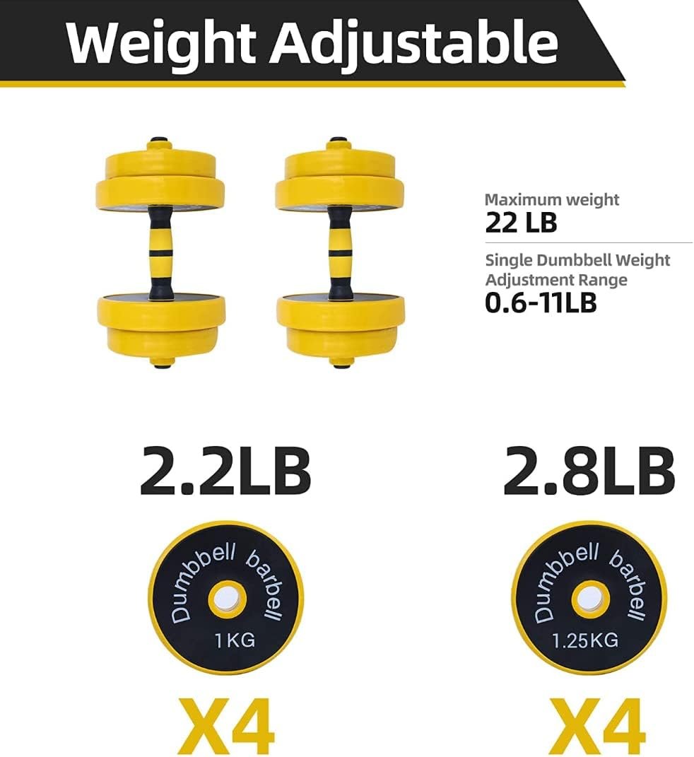multi-weight setting: this set comes with 8 weight plates: four 2.2 lb. plates and four 2.8 lb. plates. each dumbbell handle weighs 0.6 lbs. the lowest weight you can adjust to for each dumbbell is 0.6 lbs. with no plates attached. the highest weight with all the plates attached is 11 lbs. weights can be added or taken off in 2.2 lb. or 2.8 lb. increments. the barbell rod weighs 0.5 lbs., so the barbell can be adjusted from 1.1 lbs. to 22 lbs.
