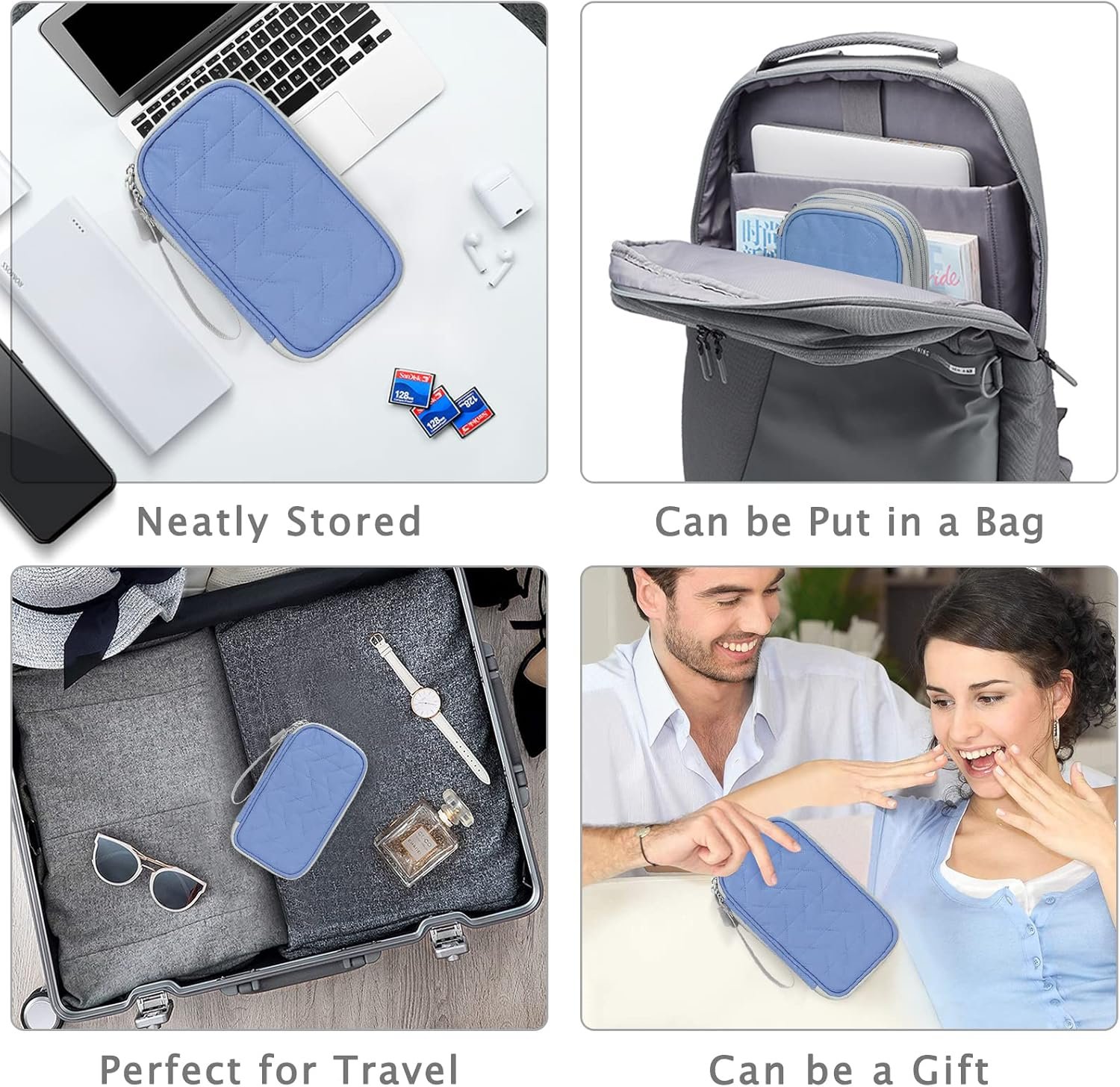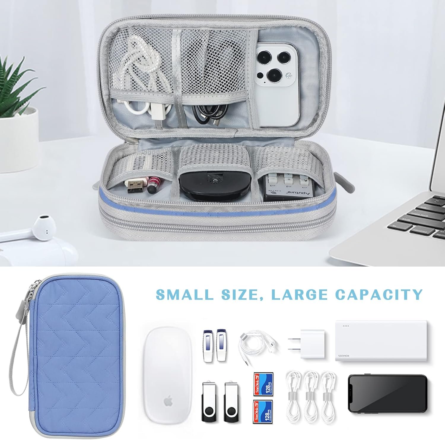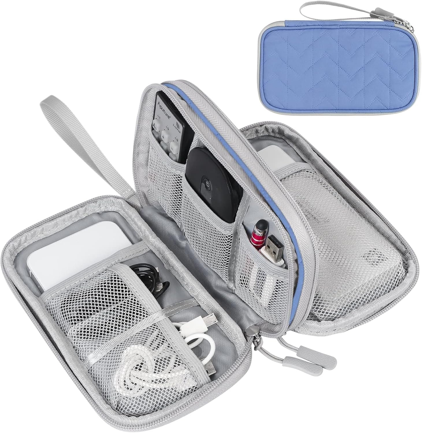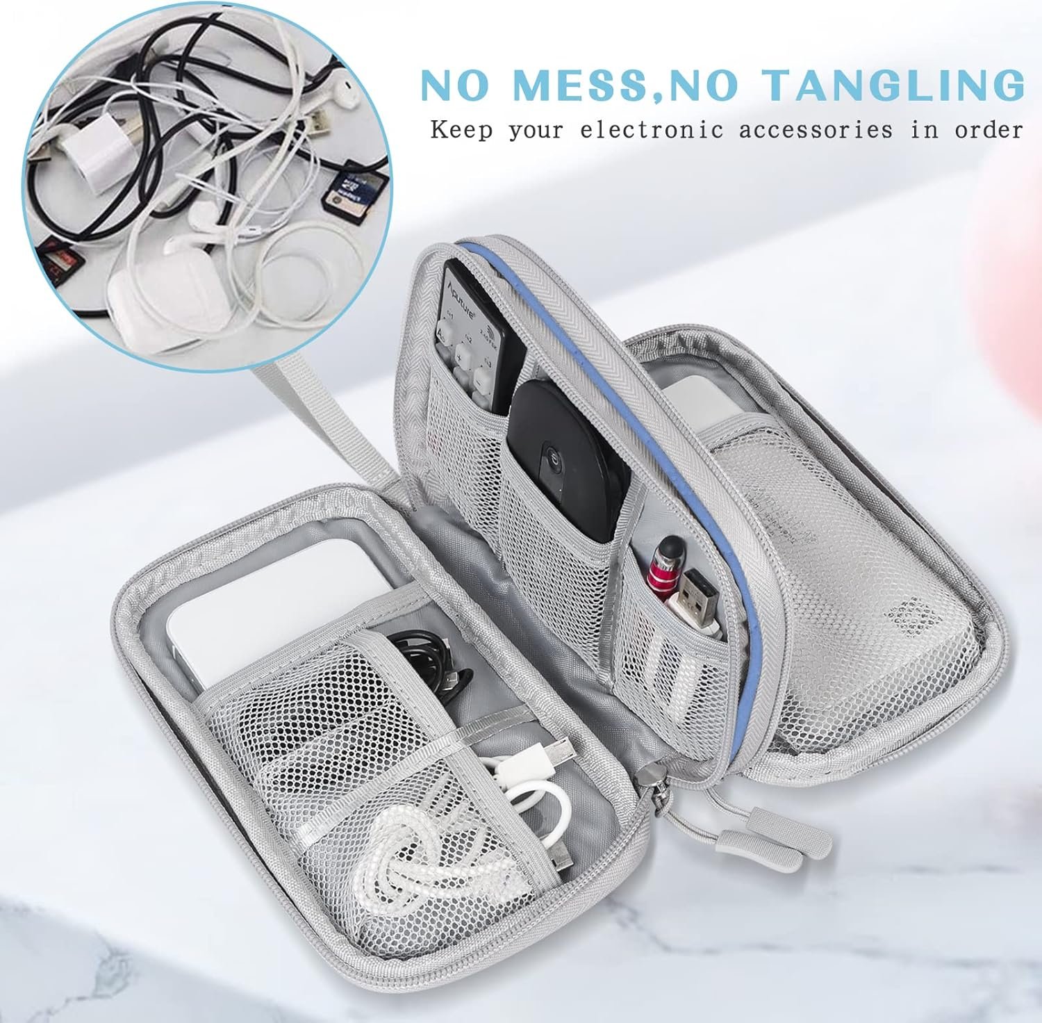Double Layers Design: The electronics storage bag has 2 layers interior compartment with enough space to take in your cords, cables, USB drive, cellphone, charger, mouse, flash drive, and other accessories.
