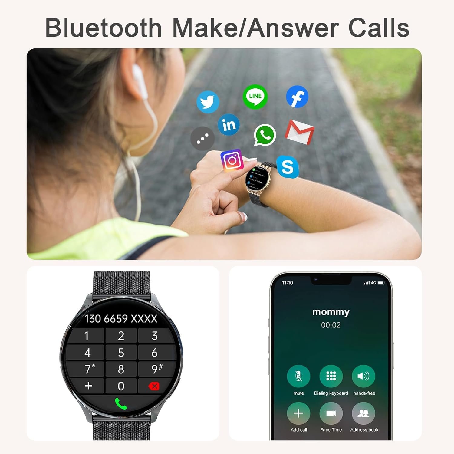 📞【Convenient Bluetooth Calls】:The women’s smartwatch supports incoming calls, SMS,Twitter, Facebook,Instagram,WhatsApp and other message notifications as well as call notifications and the smart watch vibrates to notify you.Built-in speaker and high-performance microphone allow you to make/answer calls on smartwatch (the volume of the ringtone can be adjusted.)
