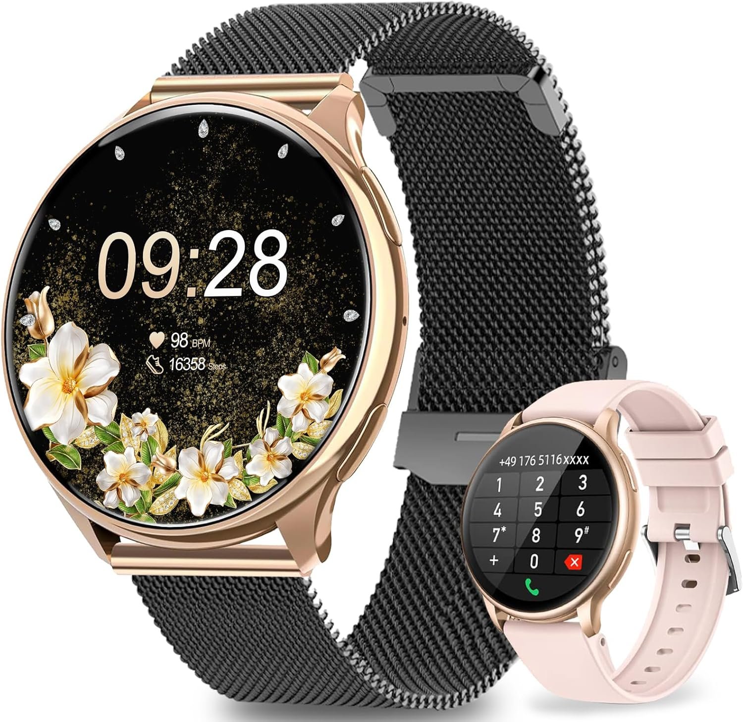 ⌚【AOD Mode&Long Battery Life】:Women’s smart watch with AMOLED screen,the high-resolution 390×390 pixel screen ensures a clear and colourful display. The blood pressure watch offers 3-5 days of battery life on a single 2-hour charge.With speaker and high-performance microphone,you can make/answer calls on your smart watch.