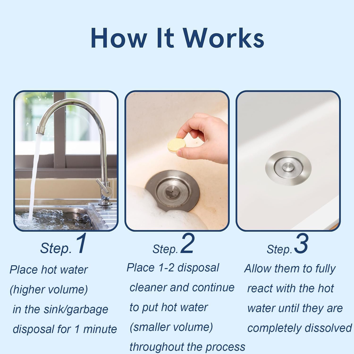 Easy To Use: 1. Turn on the hot water faucet and keep it running for 1 minute while starting the garbage disposal. 2. With hot water running slowly, place a disposal cleaner in the disposer. And them let it run for 30 to 60 seconds. 3. Turn off water and disposer and enjoy the fresh air and pleasant aroma!