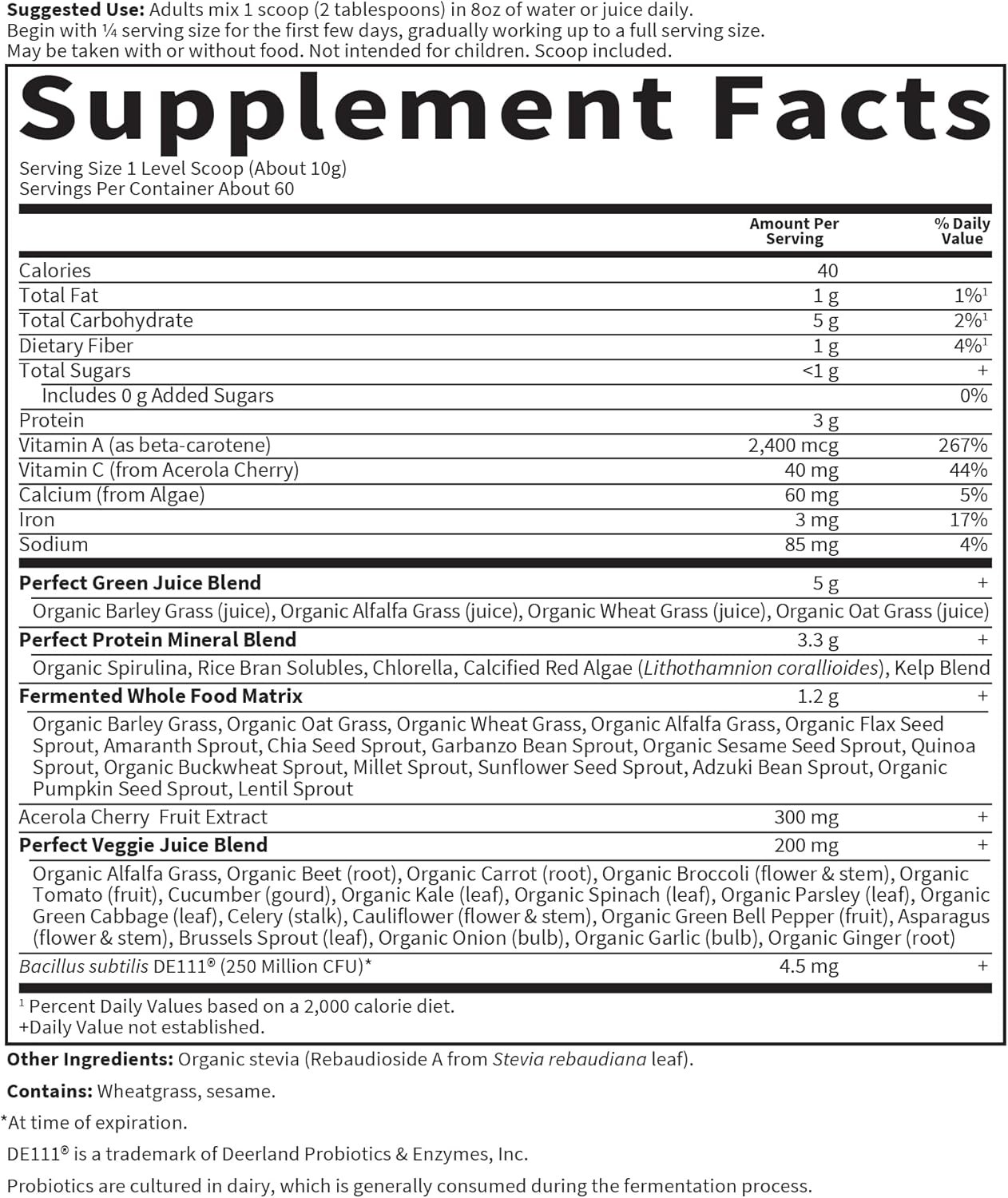 SUPERFOOD SUPPLEMENT: This greens powder is packed with green whole grasses and grass juices, micro algae, sea vegetables, whole vegetables, sprouted grains, seeds, legumes and Acerola cherries