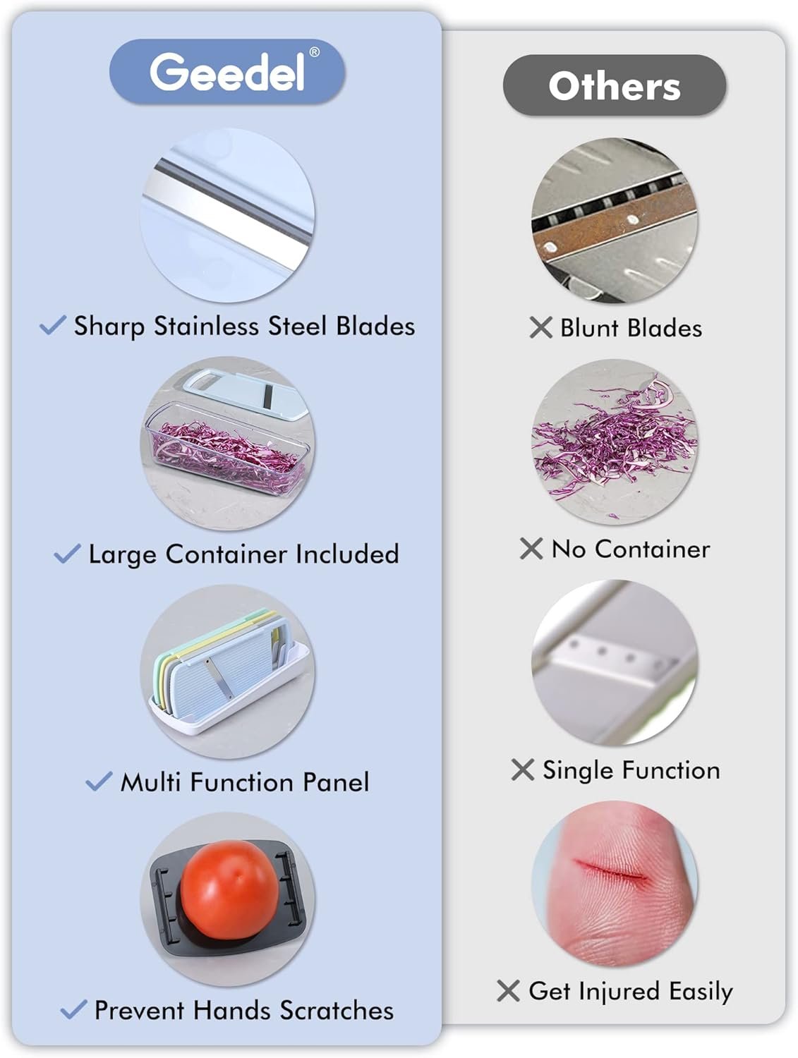 No More Messing Up : Our potato slicer with a transparent container itself, make it easier to pick up the food we slicing/shredding, but also helps collect our blades well inside at usual. No hunting through your kitchen drawer for your favorite blade