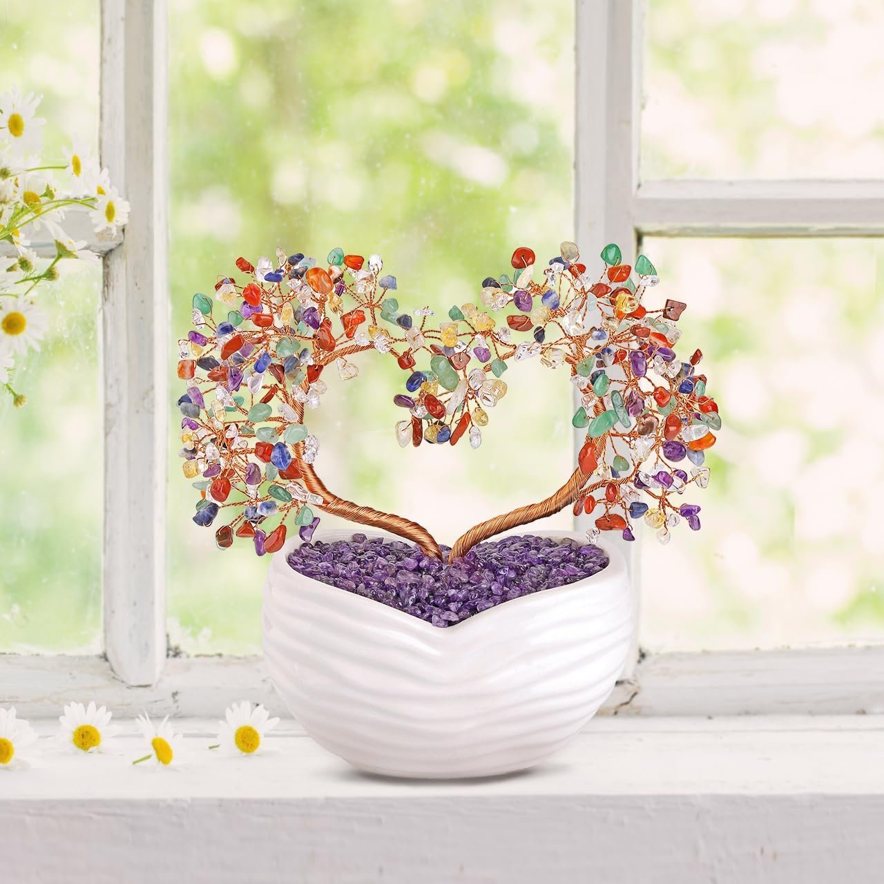 【Healing Crystals Bonsai Tree】The healing crystals bonsai tree uses natural 7 chakra quartz gemstone chips, which wrapped by rose gold copper wires in heart shape style. There are 18 copper branches on each trunks, and every branches have 9 pcs stones as leaves. Total about 324 pcs stones leaves. The base made of oval white ceramic with fixed stones decorate, will not fall easily. Each healing crystals bonsai tree is unique and handmade