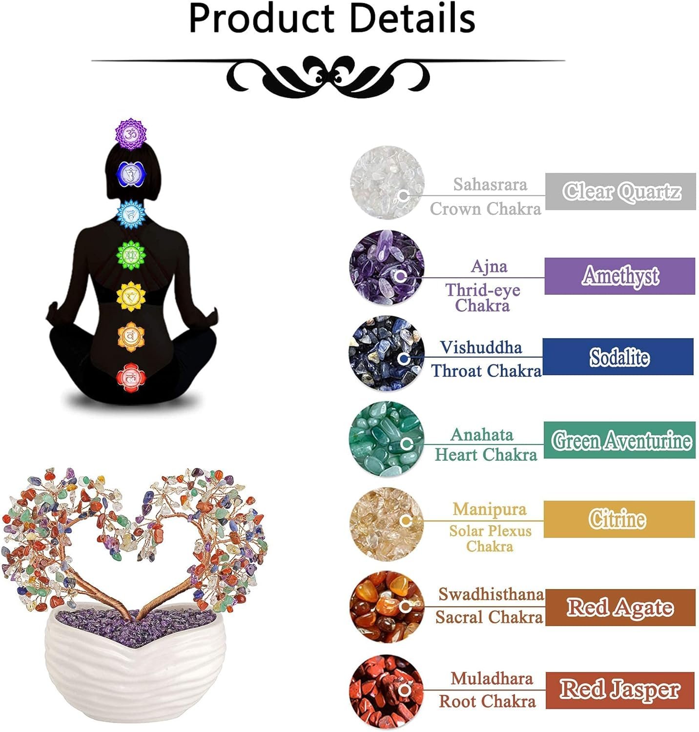 【7 Chakra Stone Healing Properties】7 natural chakra stones include: Clear Quartz, Amethyst, Sodalite, Green Aventurine, Citrine, Red Agate, Red Jasper. Each spiritual colors energy healing crystal stones are strongly connected with a special chakra to raise your vibration and keep you away from negative things. Also it can bring emotional stress relief and emit positive flow of energy