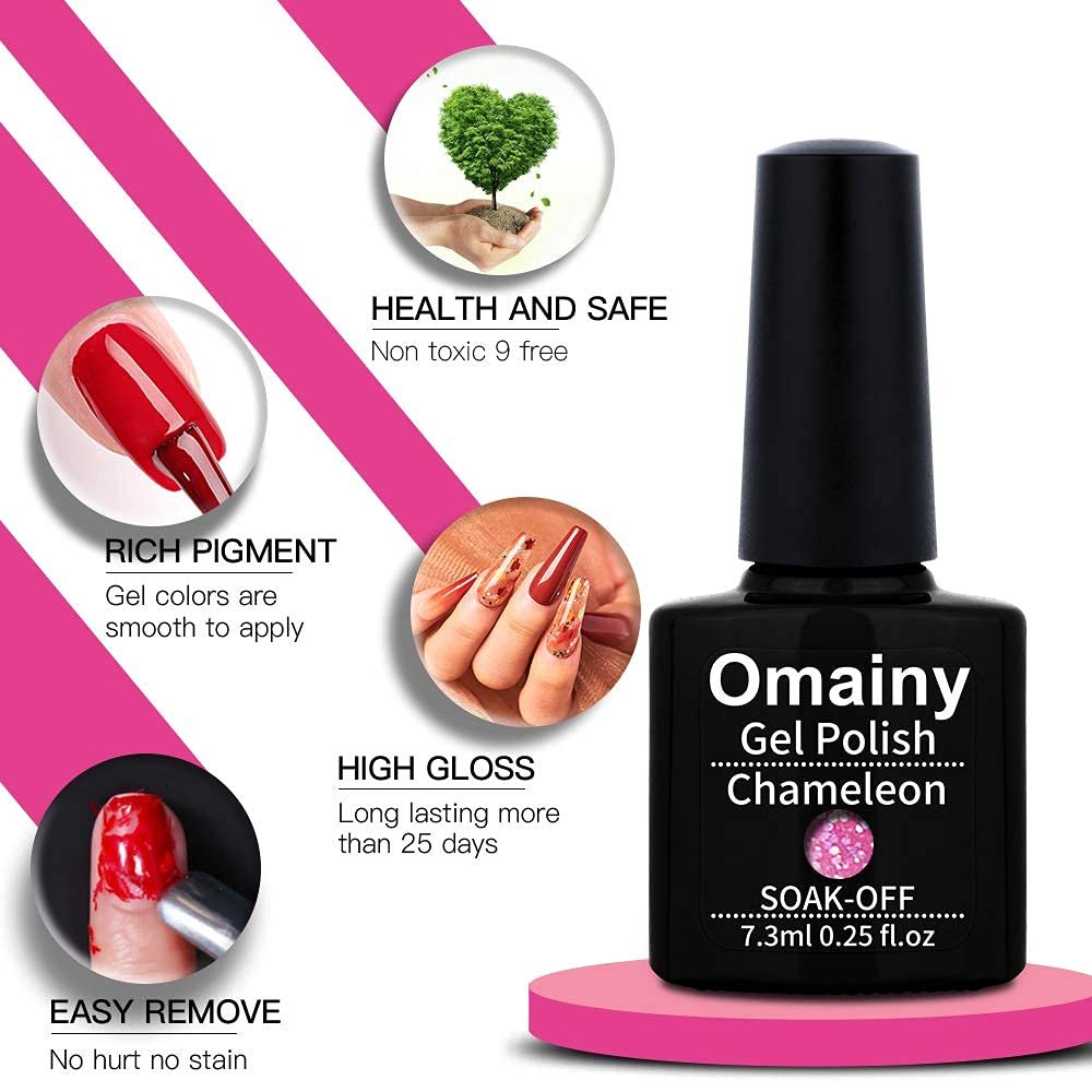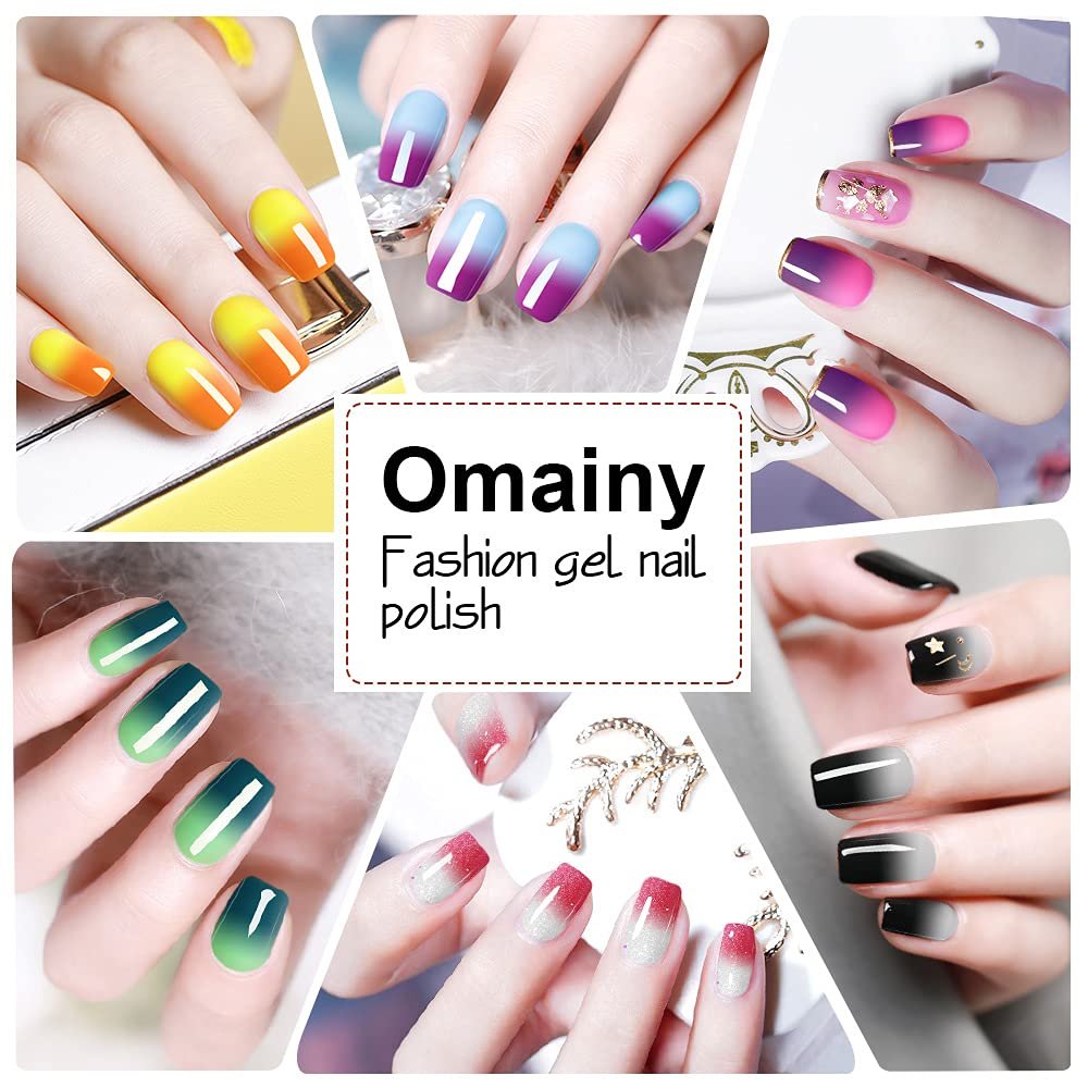 OMAINY COLOR CHANGING GEL POLISH SET:Item Include 8 temperature color changing nail polish color collection of orange to yellow,red to white,purple to light red,dark green to light green,pink red to white ,blue to light blue,black to white.