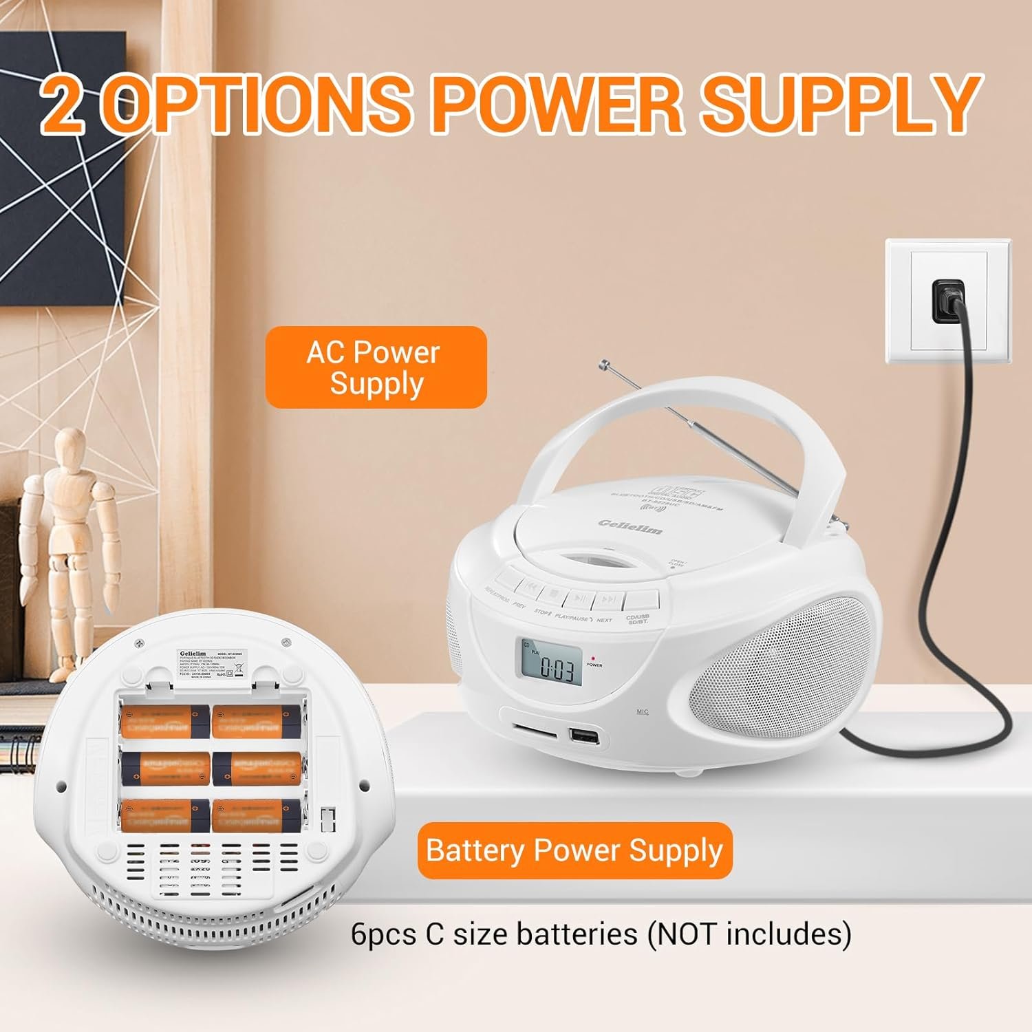 [AC/Battery Power] Portable CD player boombox supports both AC power (AC cord provided) and battery power (requires 6 C batteries, not included). Suitable for outdoor sports and indoor use. Lets you enjoy your favorite music wherever you go.