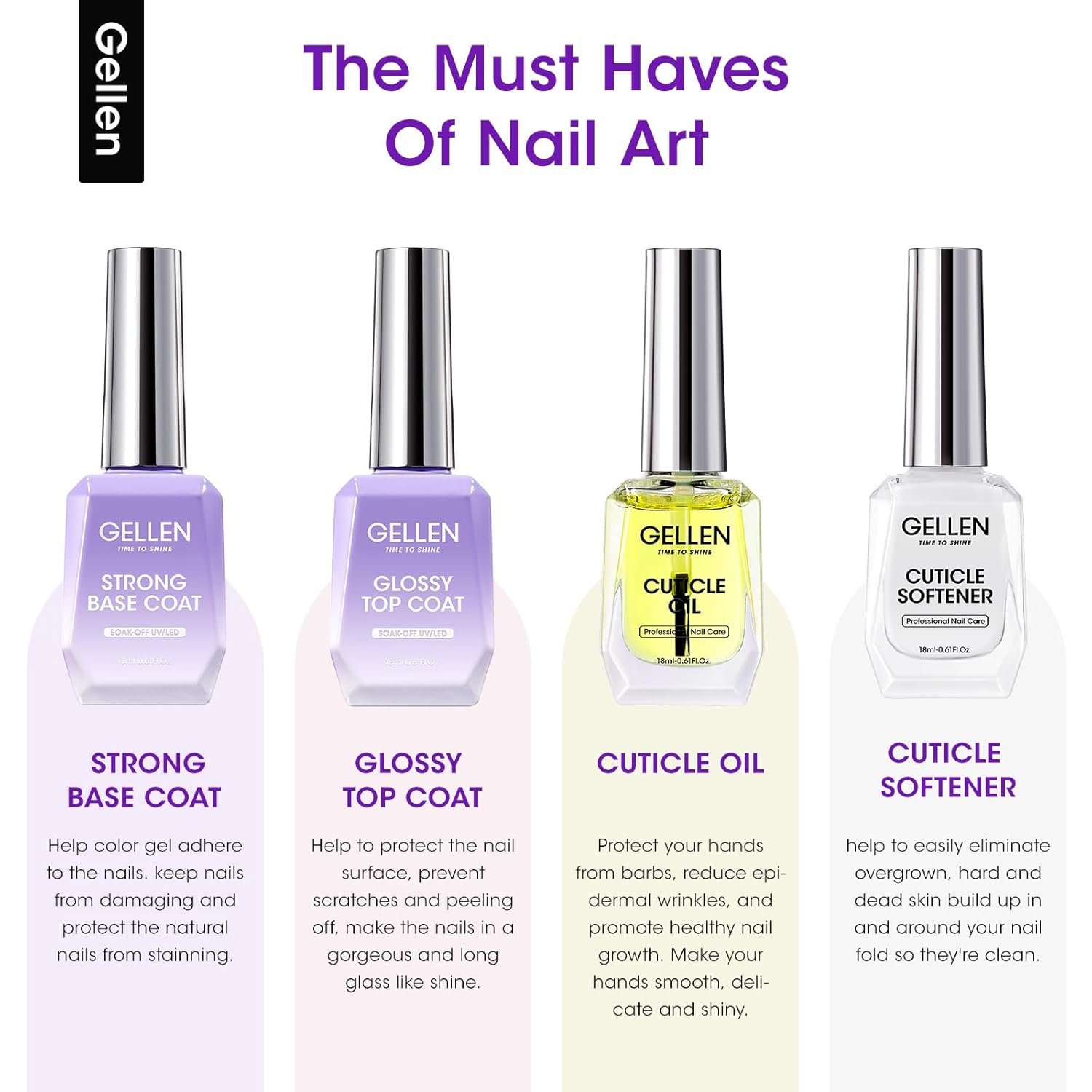 👍【THE MUST-HAVES OF NAIL ART】: The package includes 1*18ml cuticle softener+ 1*18ml cuticle oil+ 1*15ml base coat+ 1*15ml top coat. This Nail Starter Kit meets your daily manicure needs.