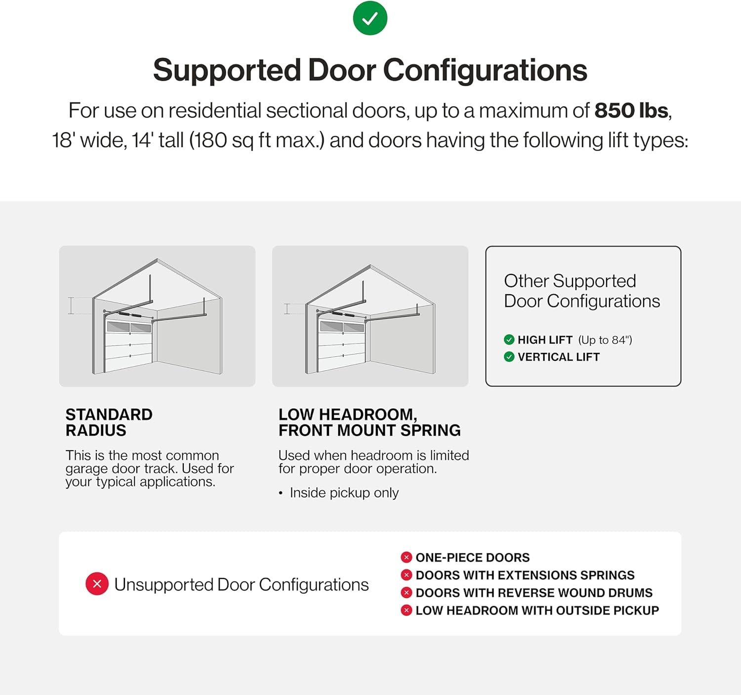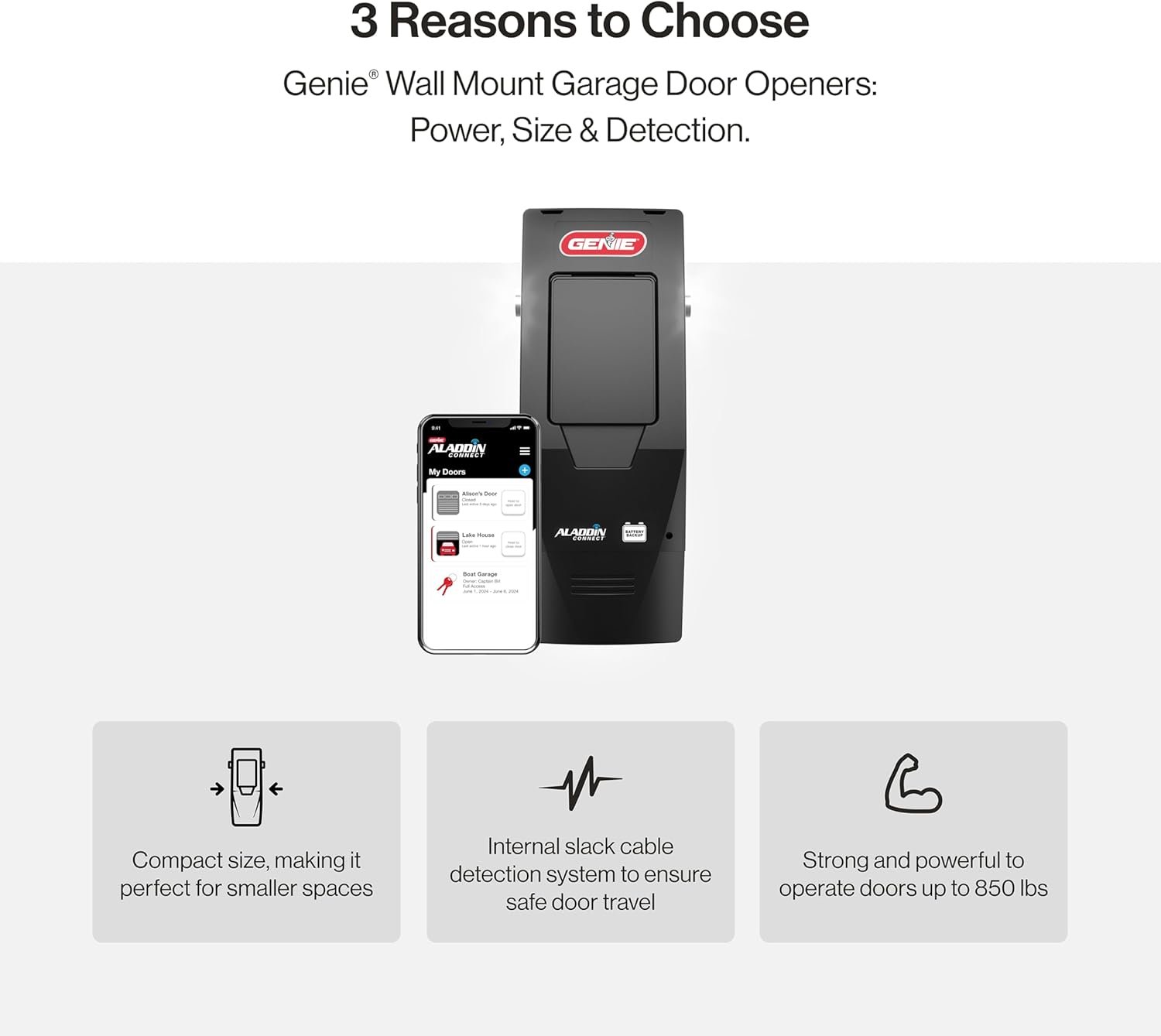 The Genie Wall Mount Smart Garage Door Opener with battery backup is equipped with a strong 24v DC motor that provides quiet and powerful operation to lift up to 850LB residential garage doors. Works on standard, high lift and vertical lift doors up to 14ft in height and max 180 sq feet