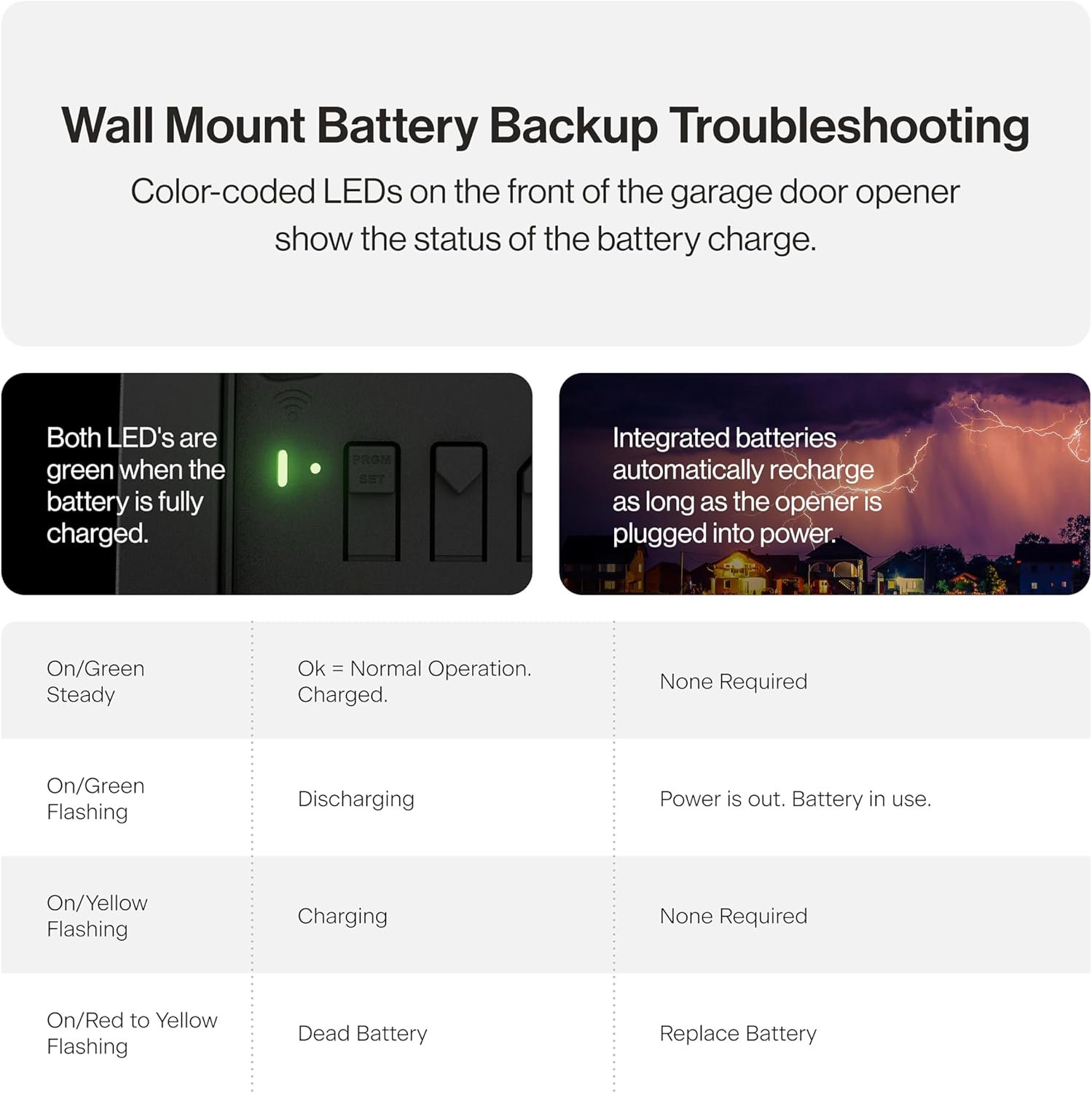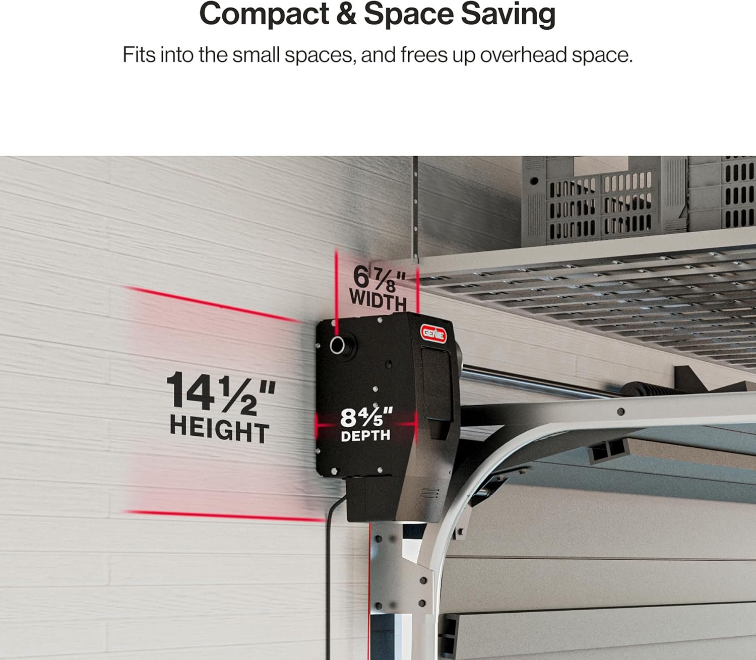 The Genie Wall Mount Garage Door Opener with battery backup is Compact design measuring 6.8 in. wide x 12 in. tall x 9 in. deep making the Genie wall mount garage door opener the smallest available, Proper installation requires a standard outlet within 6 ft. of the wall mount garage door opener
