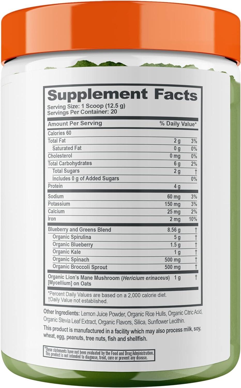 Genius Super Greens Superfood Powder, Nootropic Supplement – Organic Spirulina Powder with Lions Mane, Kale, Spinach & Antioxidants – Juice & Smoothie Mix for Energy, Immunity & Gut Health