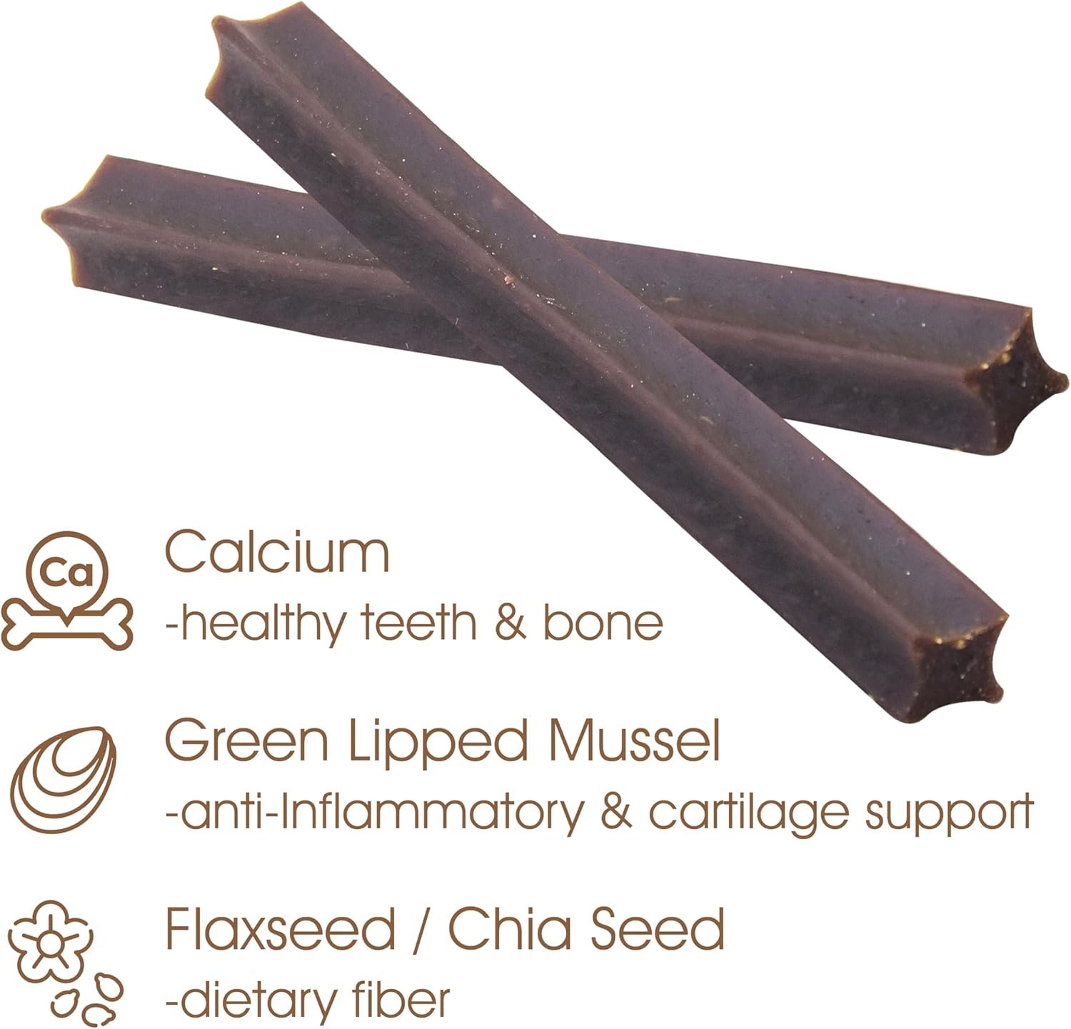 Help support your furry friend’s golden age with Get Naked Senior Health Dental Chew Sticks Dog Treats! These tasty treats are specially formulated with calcium to support healthy teeth and bones, also added Green-lipped mussel to provide anti-inflammatory and cartilage support. These senior health sticks help to maintain a healthy life so he can feel his best. These chicken-flavored treats are also grain-free and help to reduce plaque and tartar build-up as your dog chews! Treat your pup to a nutritious snack with these delicious dental chew sticks!