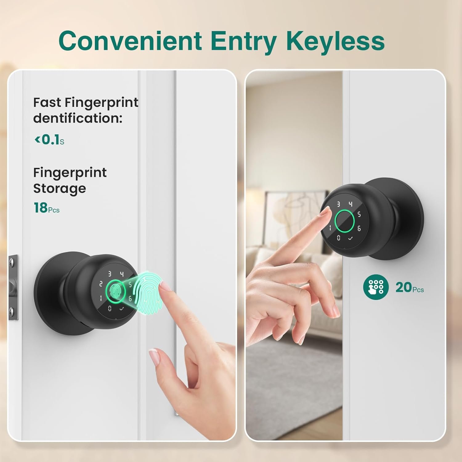 【Convenient Keyless Entry】Biometric fingerprint smart lock with keypad recognizes your fingerprint in just 0.1s, stored up to 18pcs fingerprints and offers 20 access codes to share with your family, allowing to enter your home without mechanical keys