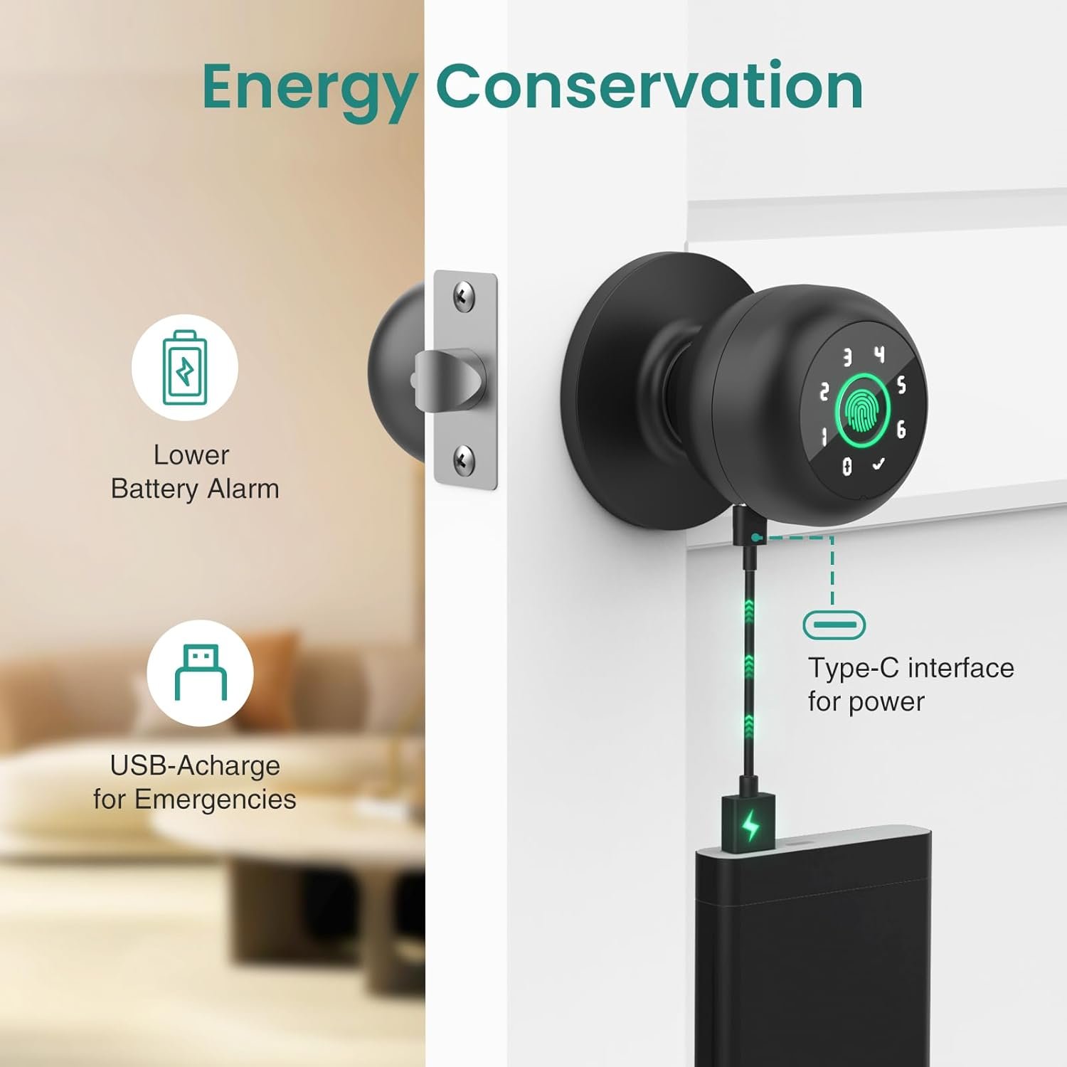 【Battery Included】K10PRO Smart door knob has 400mAh rechargeable lithium battery built with Type C port supports to charge, almost 4-6 hours can be fully charged. Fully charged battery can be used for 10000 times door unlocking, life time using 300+ times.Fully charge the door lock before use.