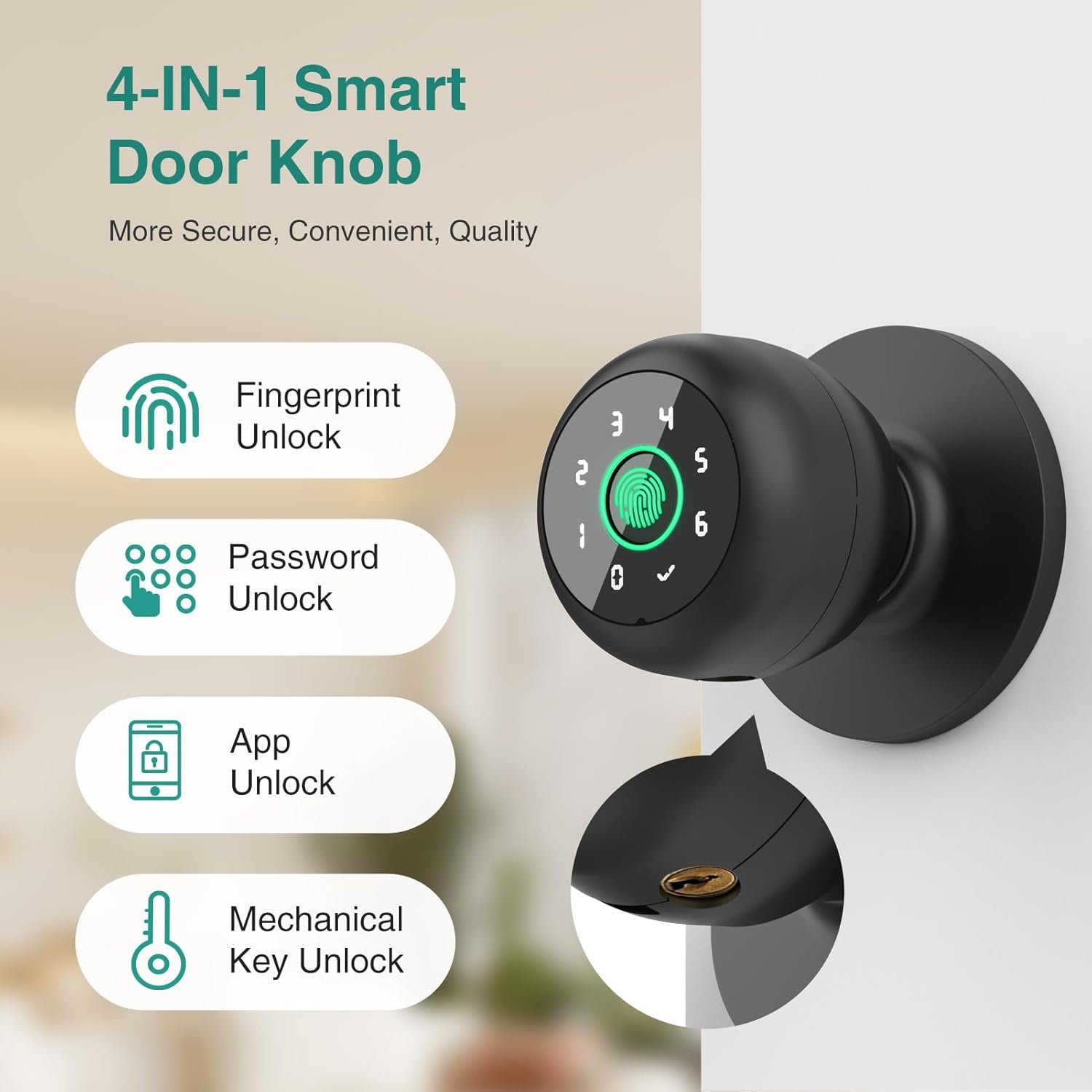 【4-IN-1 Unlock Ways】Ghome Smart door knob built with 4 unlock way, including fingerprint unlock, password unlock, App control(works with Tuya App), physical keys unlock to meet your diversity needs. Great for bedroom, living room, closet room, office, apartment, etc. Model number is K10PRO