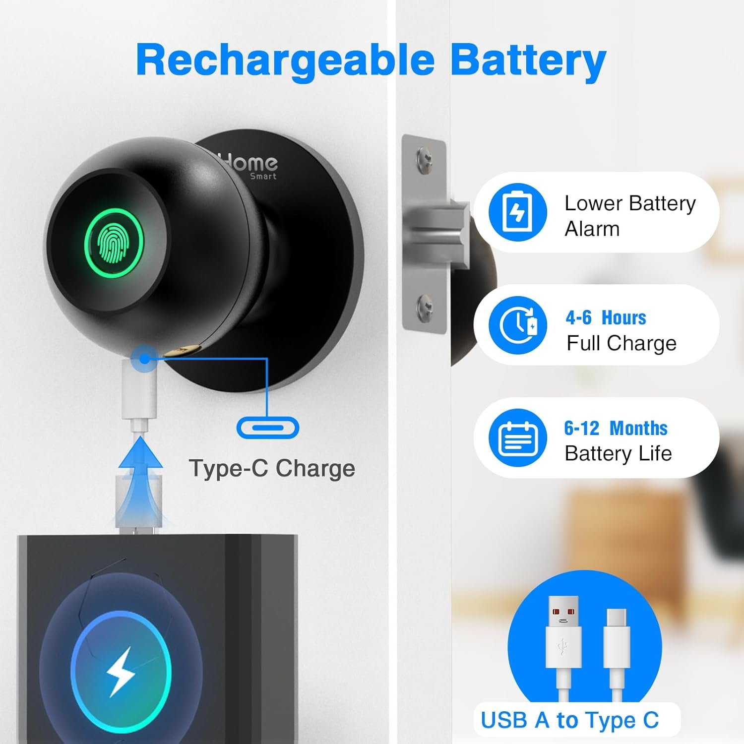 【Rechargeable Smart Door Knob】 Please fully charge the lock before first use. The K10 Smart Door Knob features a built-in 400mAh rechargeable battery and a Type-C port for emergency power. After a full charge (about 4-6 hours), it provides 8-12 months of use. Note: It only supports USB-A to Type-C charging cables and is not compatible with fast charging. This fingerprint door lock also has a low battery indication function. Please note that the battery is non-removable, and its lifespan may vary based on usage frequency.