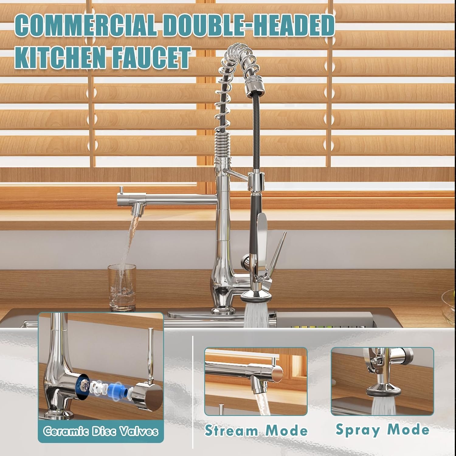 Easy to Operate: The high arc 360° rotating pull down nozzle is cleaned without dead angles. The bayonet locking design allows you to activate both nozzles at the same time for quick jobs