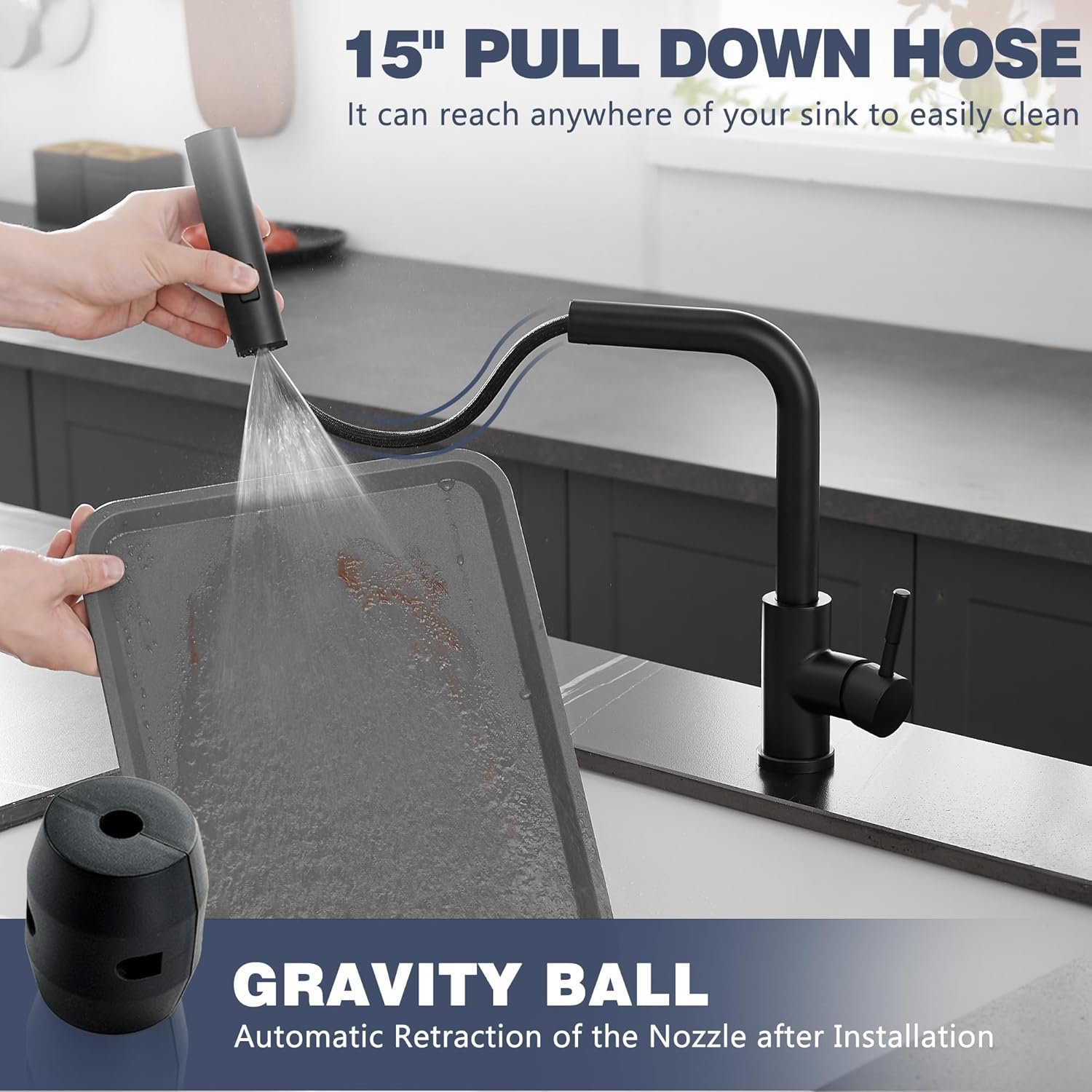 Flexible to Operate: High arc 360 degree swivel spout for full sink access, pull down sprayer to avoid splashing. Single handle design, easy control of hot and cold water and flow volume