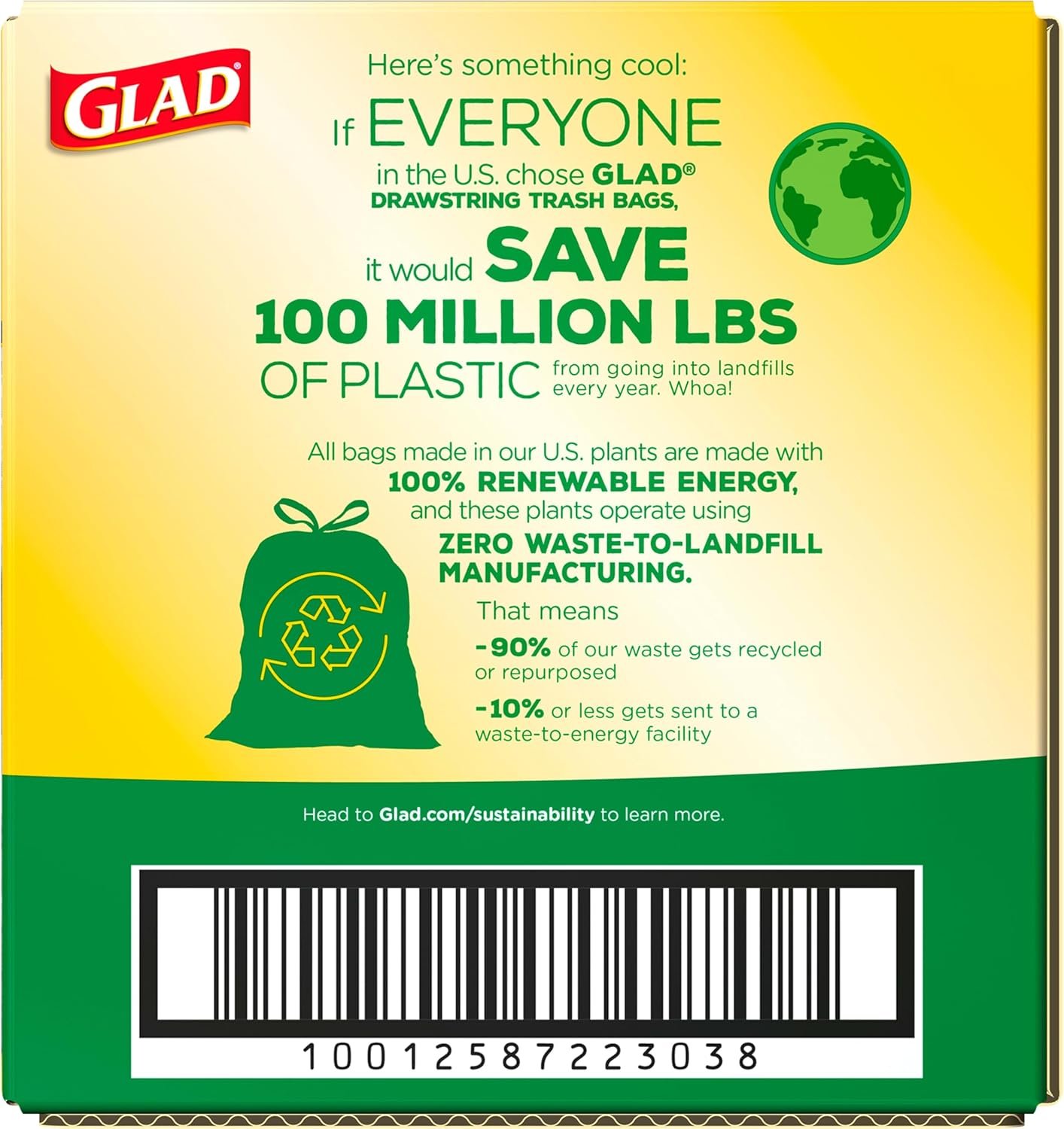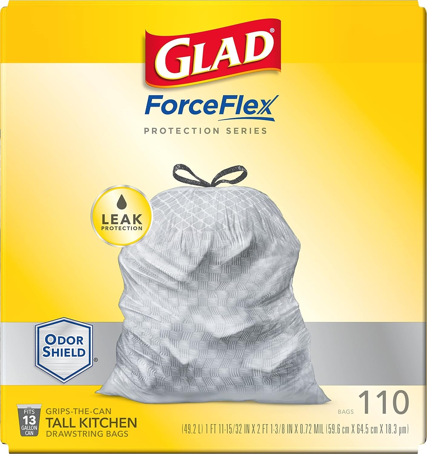 Glad ForceFlex Protection Series Drawstring Tall Kitchen Trash Bags provide stretchable strength to handle heavy trash loads plus odor control to keep your home smelling fresh. These 13-gallon drawstring trash bags are equipped with OdorShield technology to provide long-lasting, continuous odor neutralization with no heavy fragrances. Featuring double-sided seals and a reinforced bottom, these trash bags are designed with RipGuard and LeakGuard protection to prevent seepage of liquids and keep trash contained. ForceFlex technology gives the 13 gallon tall kitchen trash bags extra flex, letting them expand around sharp edges and heavy loads. Each of these tall kitchen trash bags features a durable grips-the-can drawstring that ensures the bag won’t slide down and makes it simple to close with a quick cinch. Once closed, the drawstring keeps the trash securely inside the bag to minimize spills and prevent messy trash disasters. The sturdy handle makes it easy to lift, carry and toss these Glad kitchen trash bags. Each bag measures 1 foot 11 15/32 inches by 2 feet 1 3/8 inches, so it’s just the right size for most kitchen garbage cans, including simplehuman. It’s better than all good. It’s all Glad.