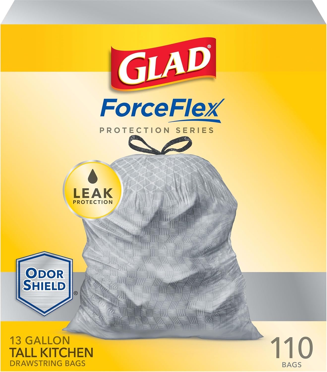 TALL KITCHEN GARBAGE BAGS: One hundred ten (110) 13-gallon Glad ForceFlex Protection Series Drawstring Tall Kitchen Trash Bags, designed to handle the heaviest loads without tearing