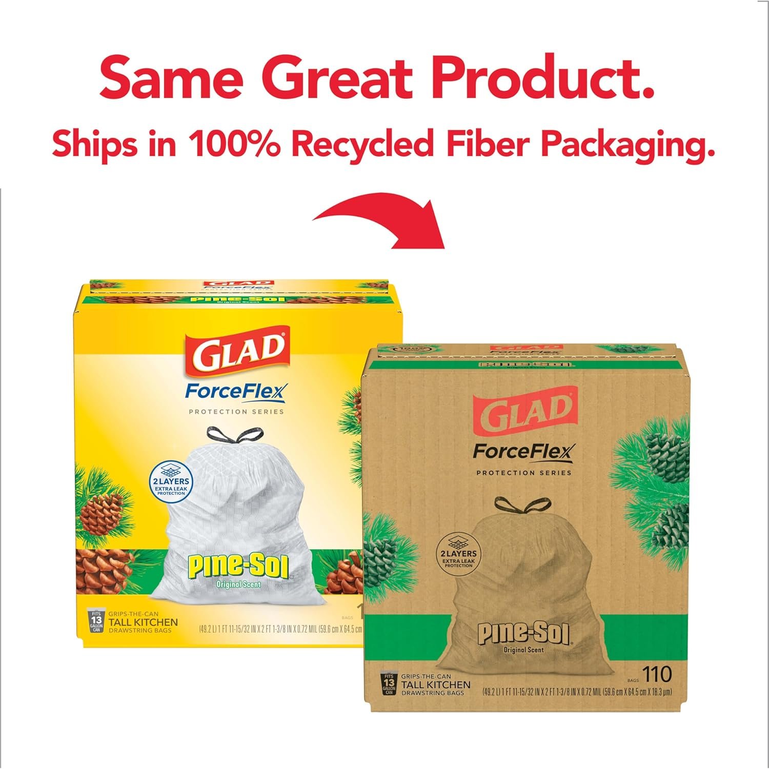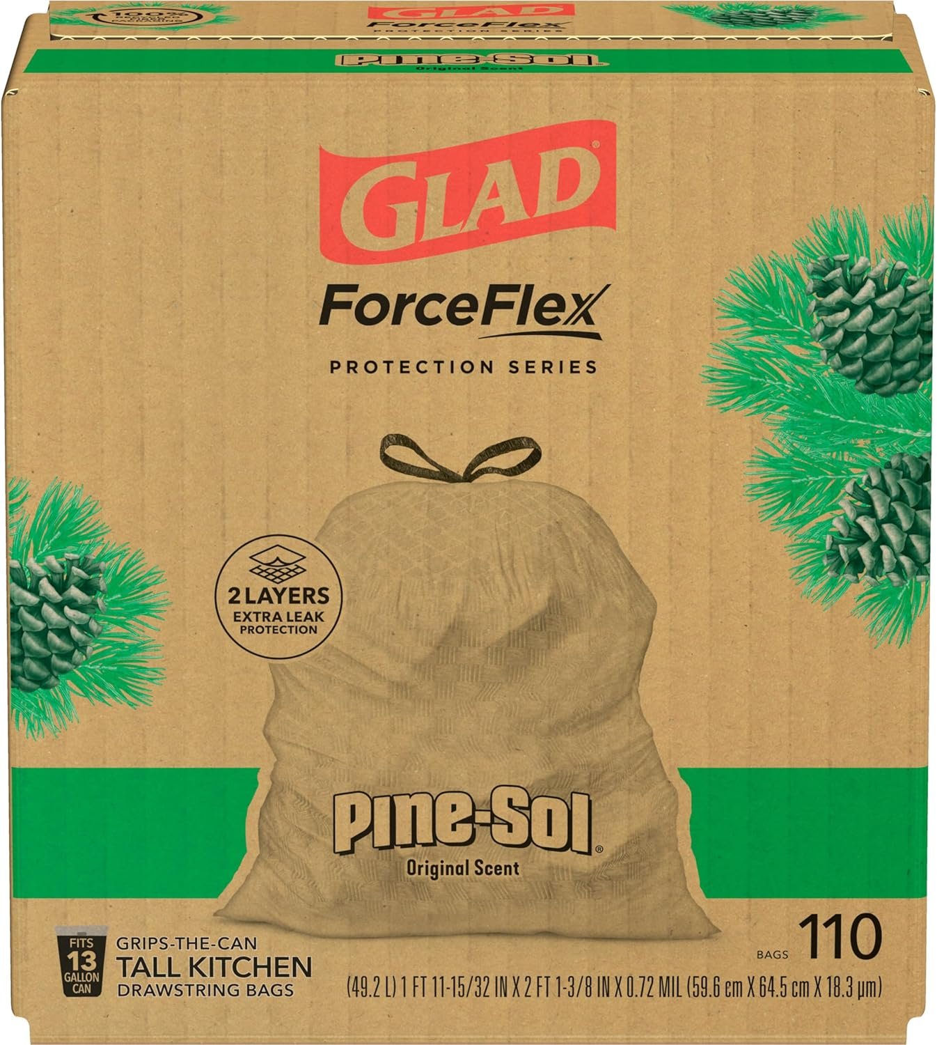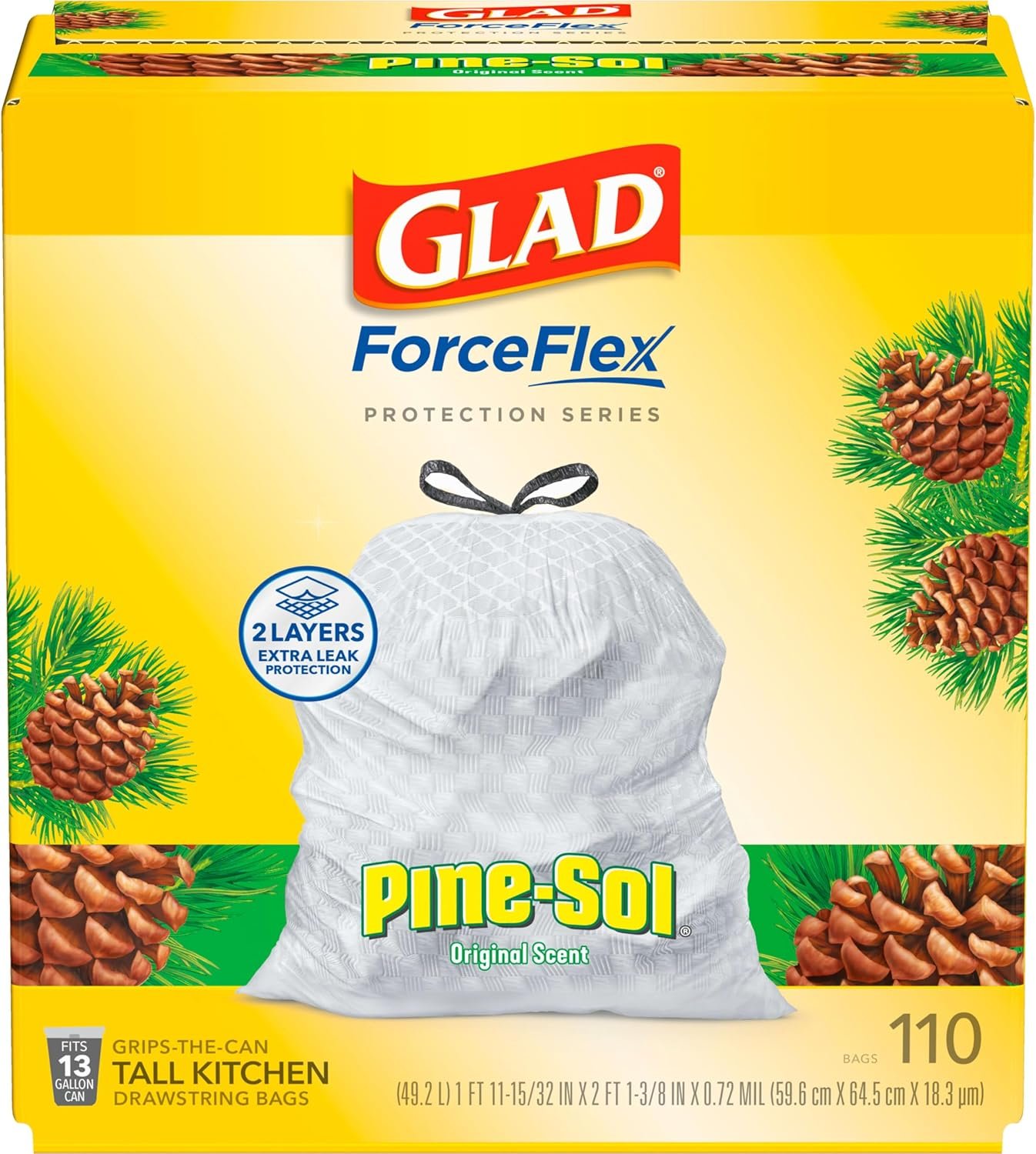 Keep your trash contained with the durability of Glad and the fresh scent of Pine-Sol. Glad Tall Kitchen Drawstring Trash Bags are designed with ForceFlex technology to give extra flex as it expands around sharp edges and heavy loads, so you can pack it in without ripping. These dual layered trash bags feature RipGuard and LeakGuard technology to resist punctures, rips and tears, and the seepage of liquids. Glads patented dual layer technology provides two layers of strength and stretch for 2X Leak Protection with double side seams and a reinforced bottom. A burst of freshness with Pine-Sol Original Scent helps keep your kitchen pleasantly smelling fresh. Let the stretchable strength of Glad handle all the messes your busy daily life can throw at it and then some. The durable Grips The Can Drawstring ensures that the bag stays in place and makes it easy to lift, carry, and toss the bag. Take on trash with the confidence of Glad. Glad 13gal bags are comparable to Simplehuman E, F, G, H, J, K, M, N, P, or Q trash bags**.**Simplehuman is a trademark of Simplehuman, LLC. Glad is not sponsored by or affiliated with Simplehuman.