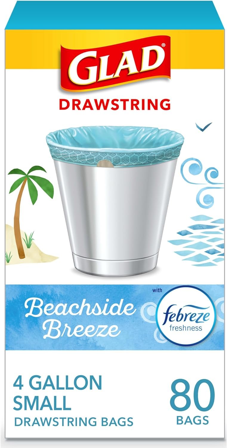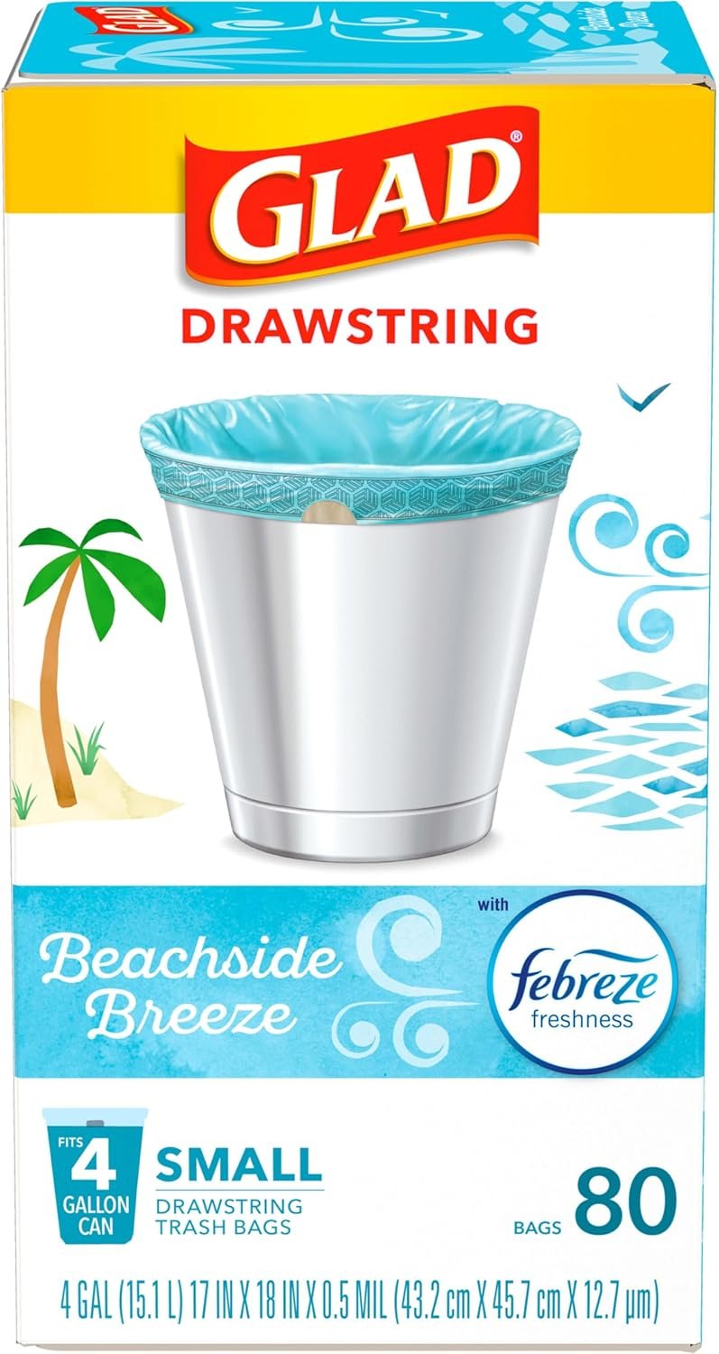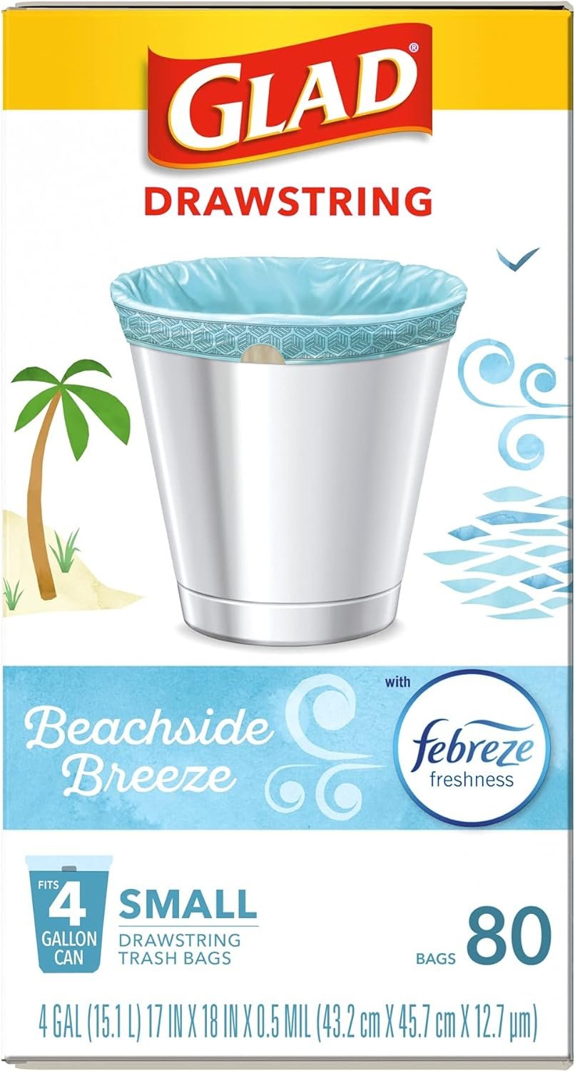 Glad OdorShield Drawstring Small Trash Bags with Febreze provide strength plus odor control, to keep your home smelling fresh. These small garbage bags are made with OdorShield technology and Febreze freshness to provide continuous odor neutralization, based on time lapse technical evaluation. Featuring a blue hue and printed design around the internal ring of the bag, these trash bags add an aesthetic touch to any room when it is folded around the edge of the can. These 4 gallon size trash bags in a fresh, airy scent fit small size trash cans and are great for in the bathroom, in home office, bedroom and laundry room. Certain trademarks used under license from The Procter & Gamble Company or its affiliates.