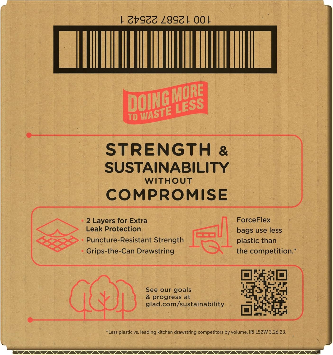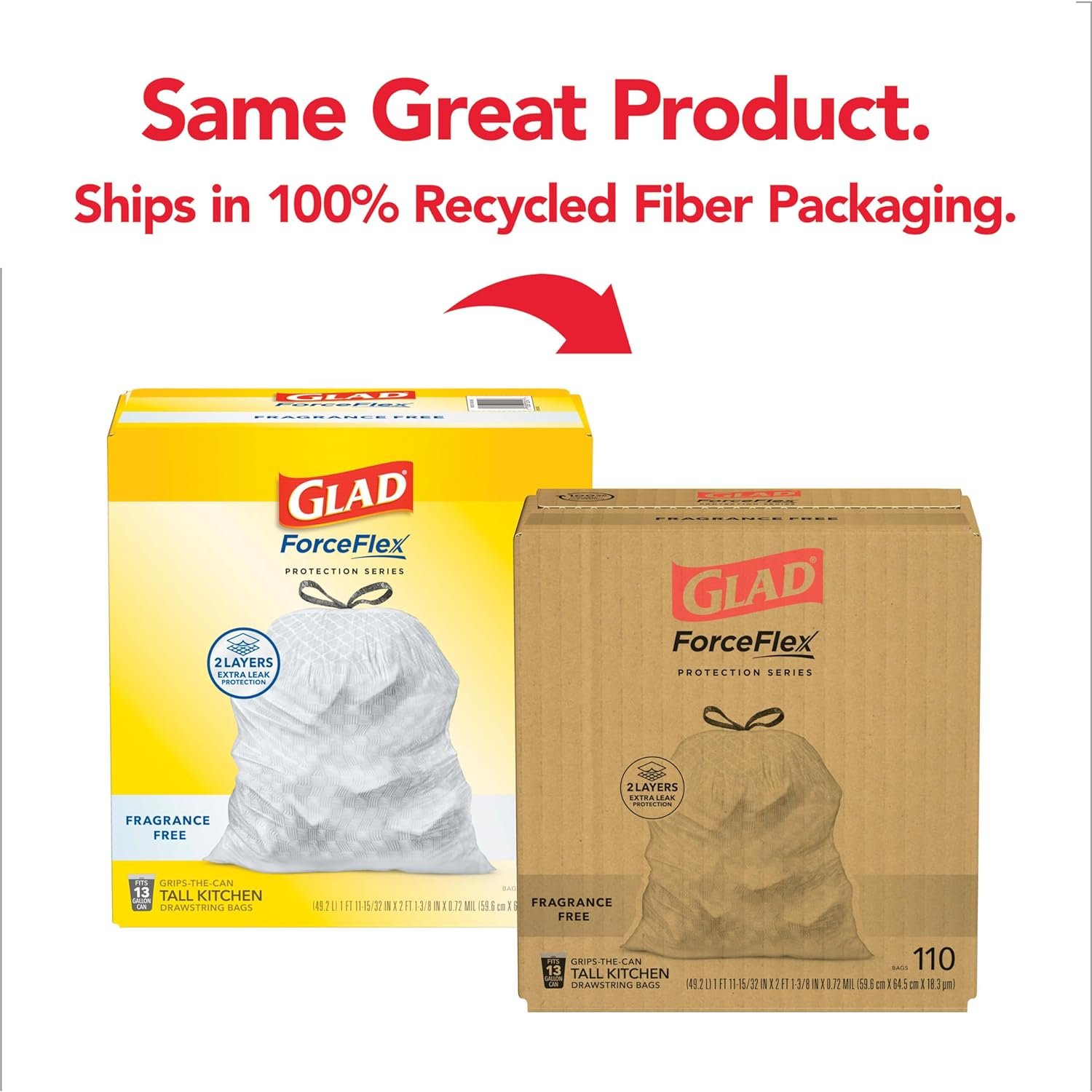 Glad tall kitchen trash bags feature 2 layers of leak protection and ForceFlex technology to resist punctures, rips and tears. These dual layered drawstring trash bags are made with 100% renewable electricity* in a zero waste to landfill facility; that means 90% of waste gets recycled or repurposed and 10% or less gets sent to a waste to energy facility. Here is something cool: if everyone in the U.S. chose Glad drawstring trash bags, it would save 100 million pounds of plastic from going into landfills every year**. The durable grips-the-can drawstring ensures that the bag stays in place, and provides a sturdy 3 ply handle, making it easy to lift, carry and toss the bag. *For bags manufactured in our US plants. All electrical energy used is offset by virtual power purchase agreements and purchased renewable energy certificates. **Based on IRI sales data. If existing non-glad drawstring buyers switched to Glad drawstring bags. Glad 13gal bags are comparable to Simplehuman E, F, G, H, J, K, M, N, P, or Q trash bags***.***Simplehuman is a trademark of Simplehuman, LLC. Glad is not sponsored by or affiliated with Simplehuman.