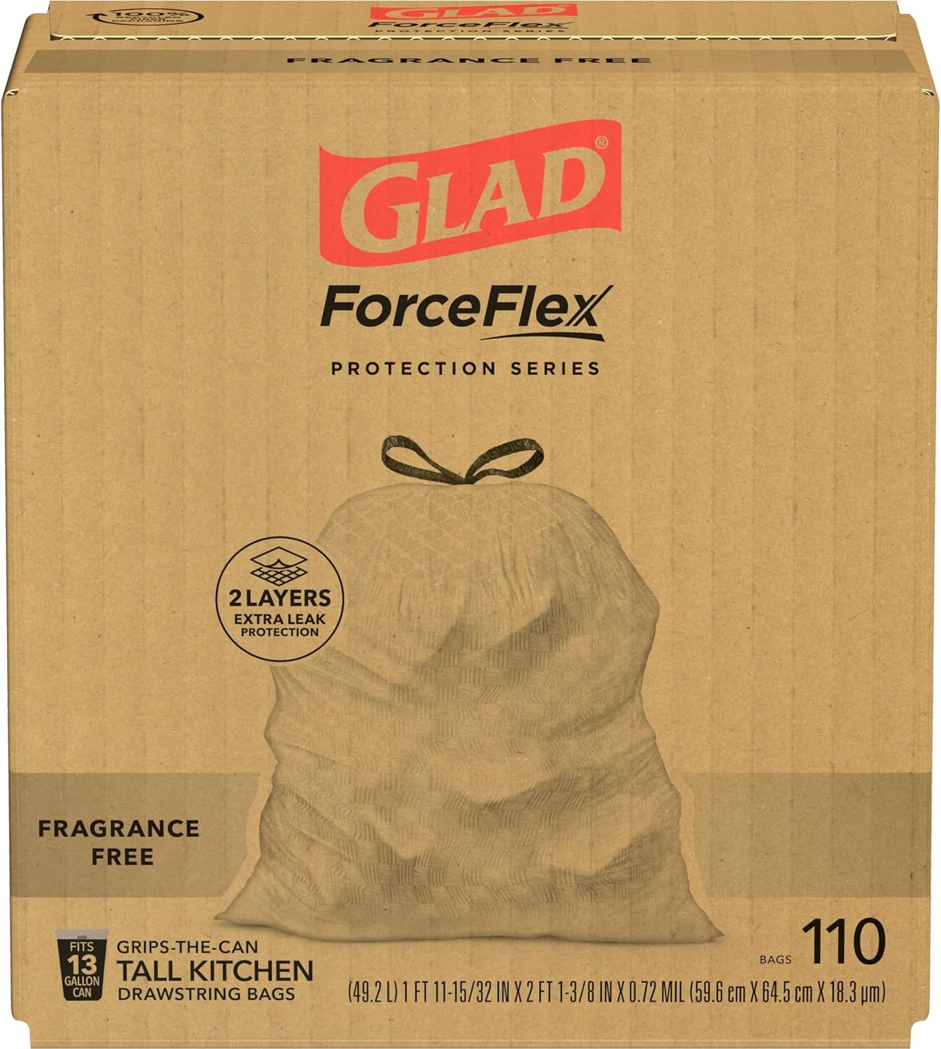 13 GALLON PLASTIC TRASH BAGS: Avoid messy kitchen disasters with Glad Tall Kitchen Drawstring Trash bags, designed with stretchable strength to handle the heaviest kitchen loads without tearing