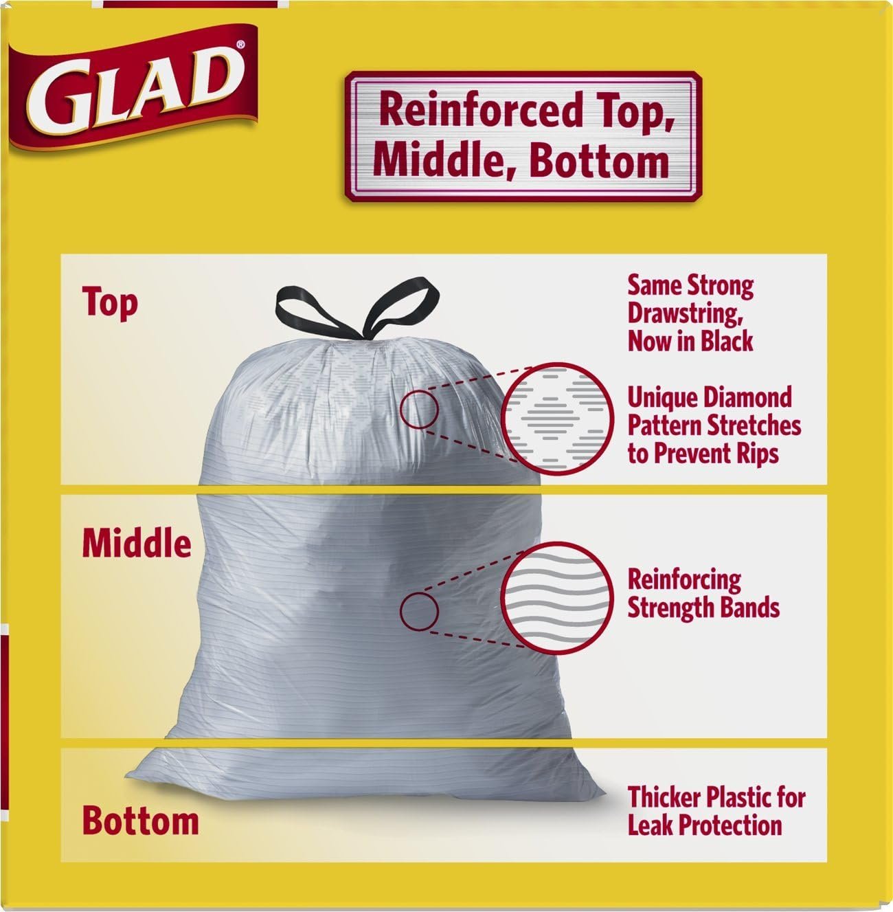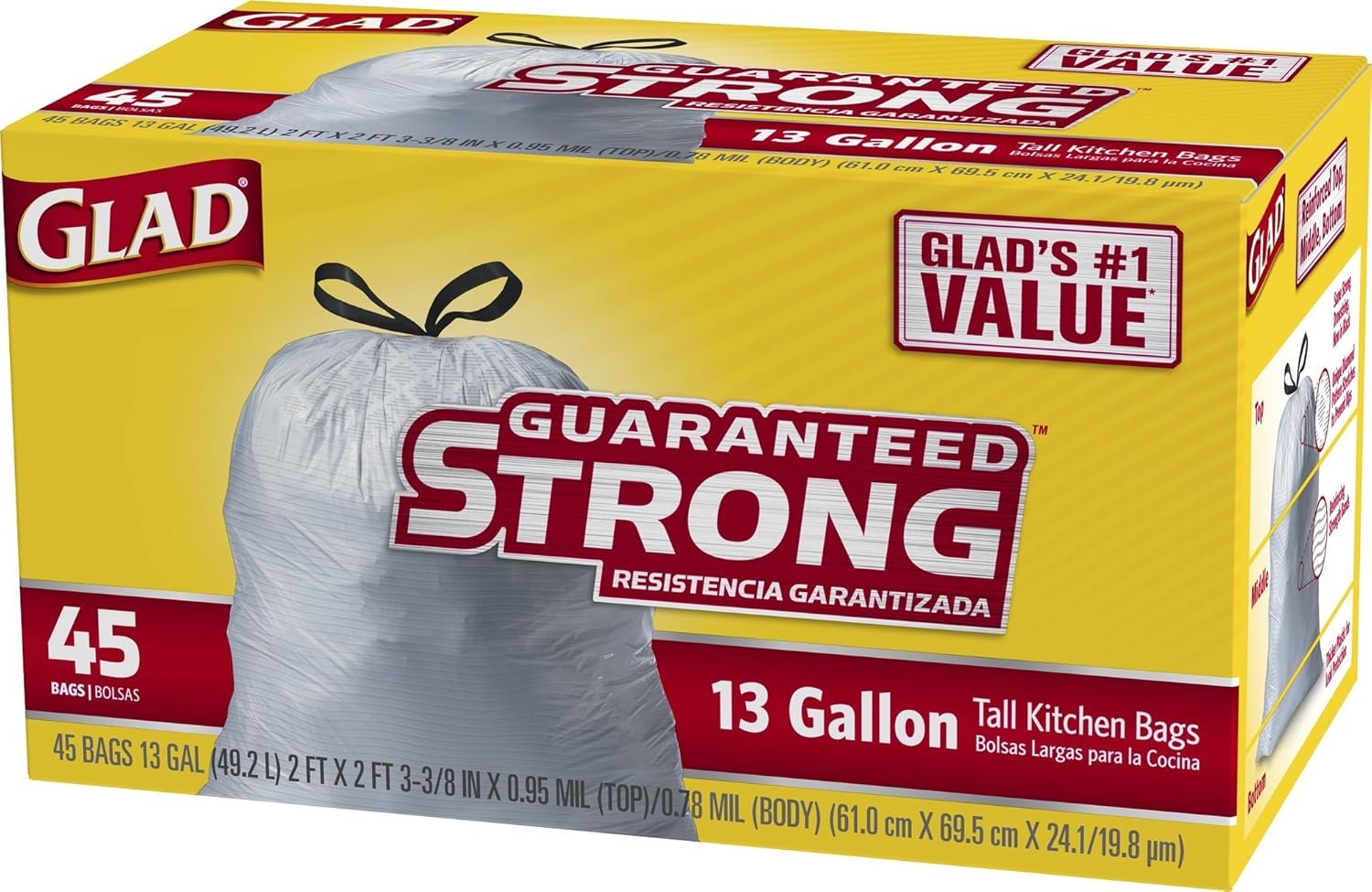 Glad Tall Kitchen Drawstring Bags are made strong and durable to help prevent trash disaster in the home. These kitchen garbage bags are guaranteed strong with reinforcing strength bands that make the trash bags stronger while using less plastic, when compared to a leading branded bag. They are reinforced at the top, middle and bottom. These drawstring bags are made with a unique diamond pattern that stretches around objects to prevent rips, reinforcing bands to add strength plus a thicker plastic for leak protection. The strong 3-layer drawstring closure makes trash removal easy to lift, carry and toss away. Simply pull up on the drawstring to close the trash bag and then knot the drawstring for extra security. The 13 gallon size is perfect for use in the kitchen and other areas throughout the home. They are also great for seasonal cleaning needs like Spring Cleaning and Back to School. Get a handle on trash with Glad.