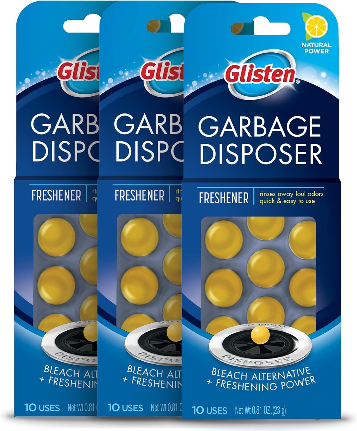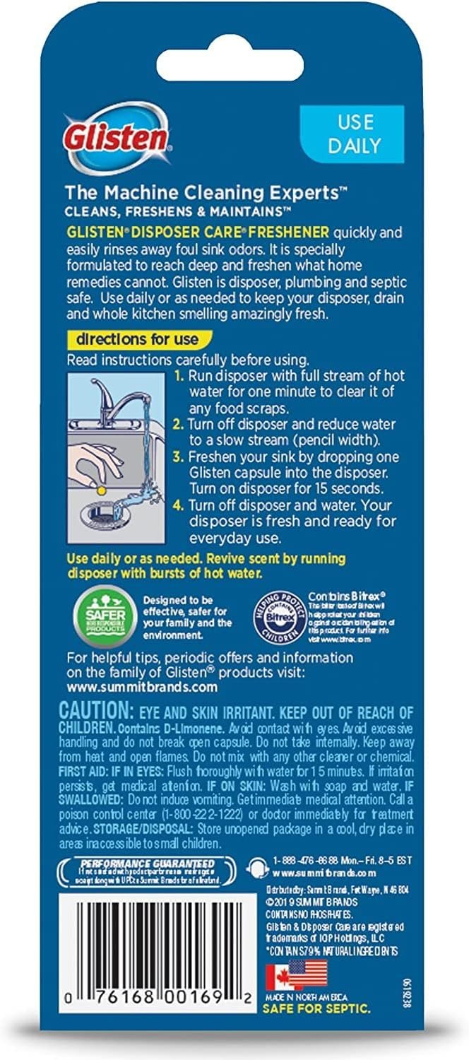 Lightly trapped food down in the kitchen sink can wreak havoc on your home sweet home. Fight back against deep sink odors with Glisten Garbage Disposer Freshener, a bleach alternative with freshening power. The disposer deodorizer is a convenient and easy way to freshen the disposal between deep cleanings. With no harsh chemicals, the capsules rinse away tough grunge and garbage disposal smells, leaving the sink and the whole kitchen smelling fresh. The freshener works in all disposals and is plumbing, pipe, sink, drain, and septic-friendly. Mess-free and fast-working, the convenient capsules pack a powerful punch. The disposer and drain deodorizer helps clean, freshen, and maintain disposal systems. While home remedies, air fresheners, and regular cleaning sprays or gels cover the surface, the drain disposal cleaner gets down deep to deliver superior freshening performance. The capsule quickly breaks down stubborn food particles, grease, and oil lurking in the disposer for a fresh smell in your kitchen. Use the odor remover daily, or as needed, to keep your disposal and drains odor-free. Eliminate foul garbage disposal smells with the drop of one capsule. Please read package instructions before use.
