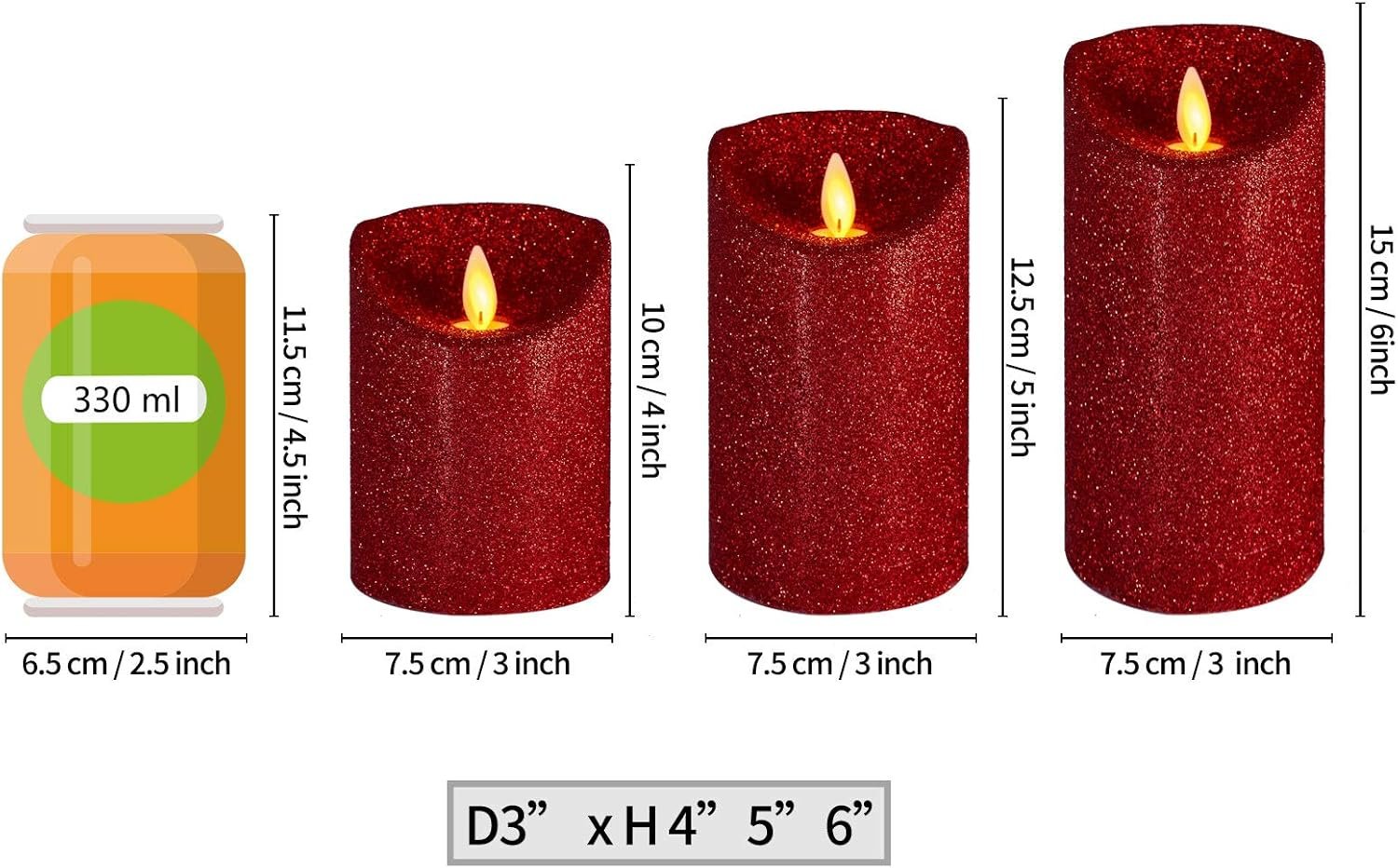 – 3 x LED Flameless Candle (Size: D 3″ x H 4″5″6″)
