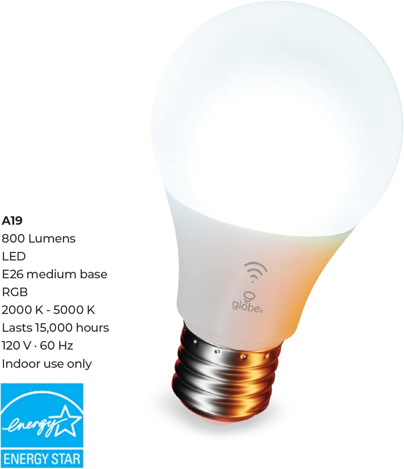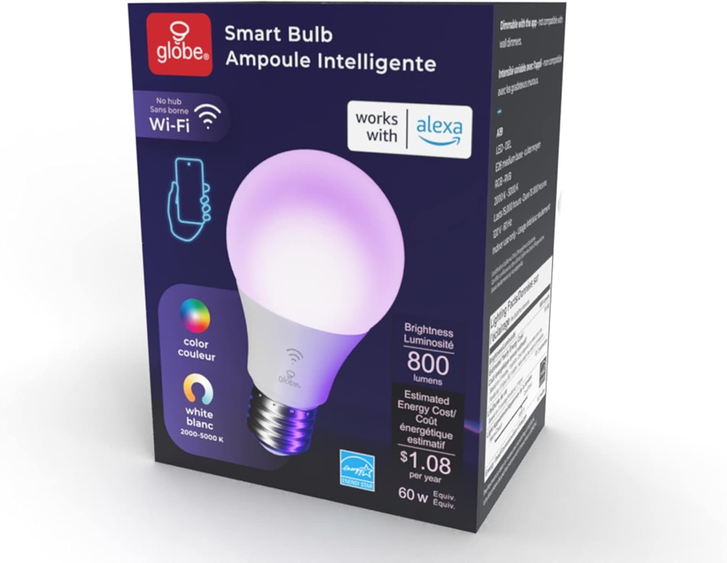 Globe Electric 50589 Color-Changing A19 LED Smart Light Bulb, 2.4 GHz Wi-Fi, 60W Equivalent 800LM, Works with Alexa Only, 1-Pack