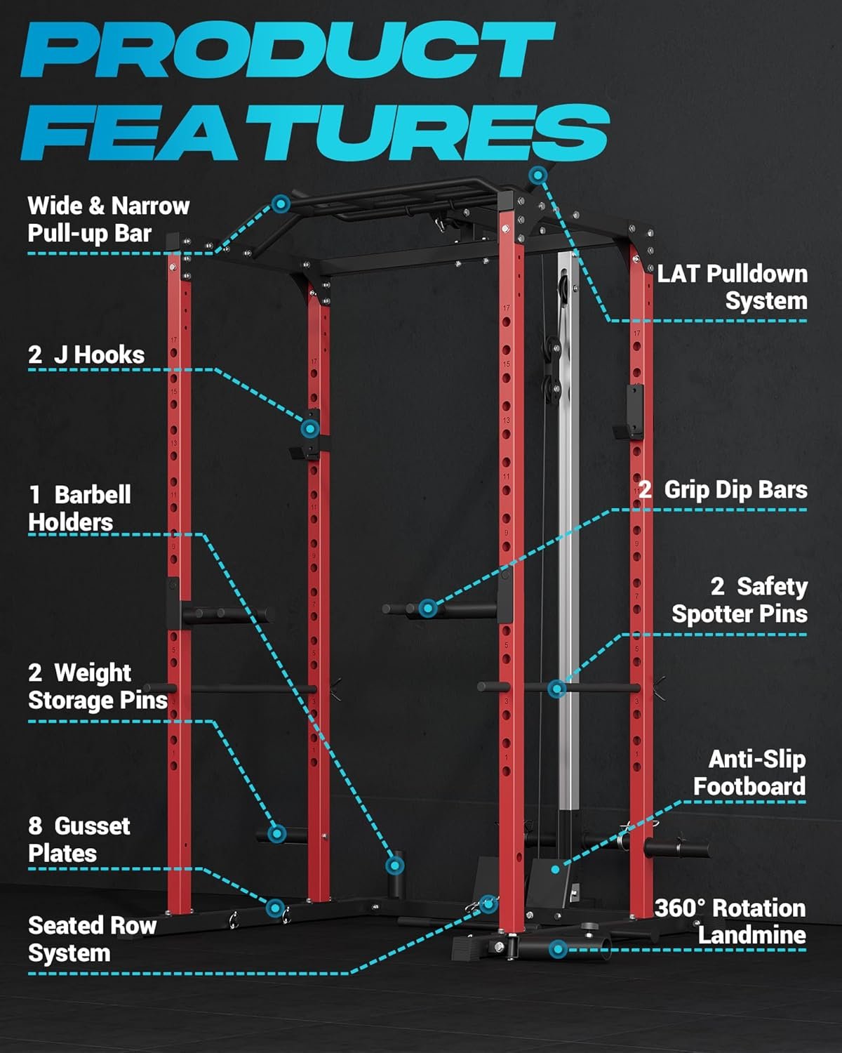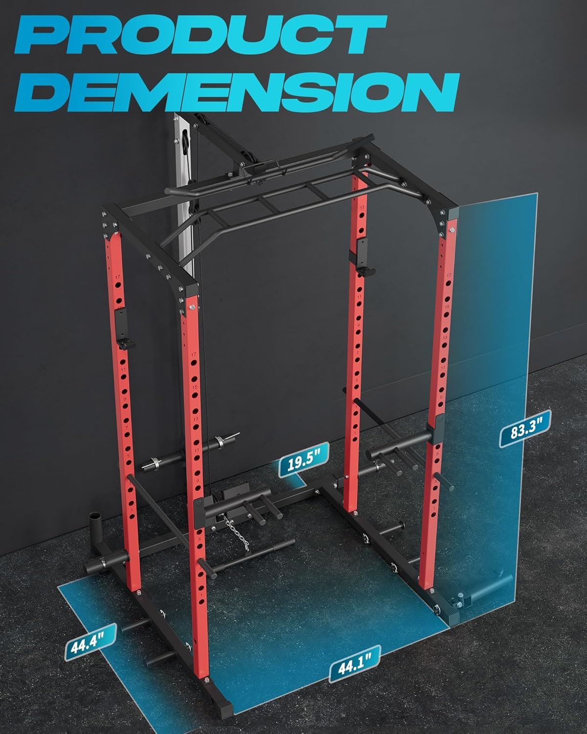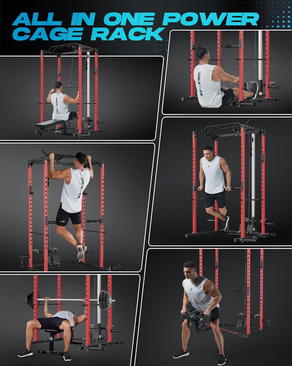 6-In-1 for HOME GYM: This power cage meets your diverse fitness needs by combining a power rack, lat pulldown, low row, chin-up, dip station, and core trainer. Enjoy the freedom to perform a wide range of exercises within a compact space.