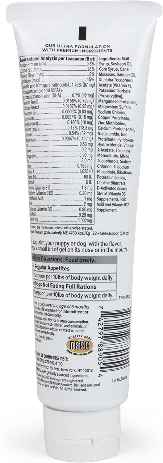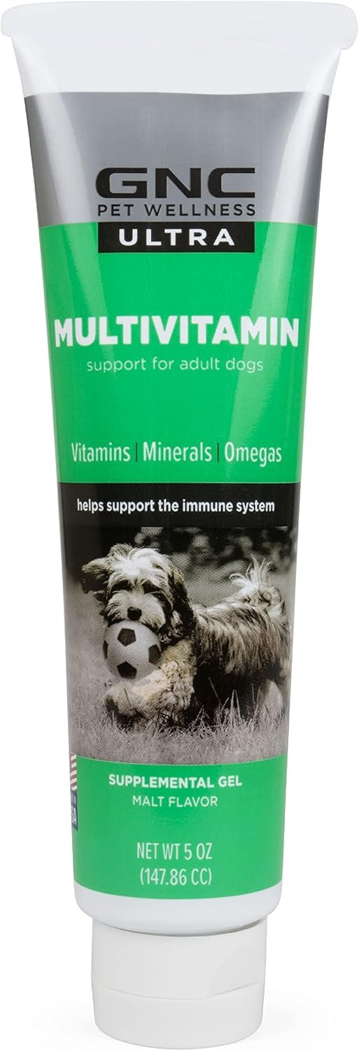 GNC Pets ULTRA Malt Flavored Multivitamin Gel/Paste for All Dogs presents a tasty way for your pet to get the vitamins and minerals it needs. Packed with essential amino acids and omegas, this dog multi vitamin supports healthy skin and a glossy coat. The gel/paste formula slides right onto your dog’s gums, making it easier than ever for your pet to get proper nutrition and supplementation. This multivitamin gel for dogs is a delicious malt flavor dogs love. Since 1935, GNC has been the leader in the development and manufacture of human nutritional supplements, and now, GNC’s commitment carries over to Pet Products. GNC Pet Products are produced at the same highest quality standards as our human supplements. GNC Pets supports happy, healthy pets. Taste tested and approved by cats and canines alike, our pet vitamins and supplements offer healthy solutions for your furry friends from head to tail. GNC Pets is proudly made in the US, providing you and your pet with safe, secure, and high-quality products. GNC Pets ensures accurate labeling and manufacturing for consumer safety. Instructions: To acquaint your puppy or dog with the flavor, place a small bit of gel on its nose or in its mouth. Feed orally. For regular appetites, feed ¼ teaspoon per 10lbs of body weight daily. For dogs not eating full rations, feed ½ teaspoon per 10lbs of body weight daily. For use in dogs over the age of 6 months. This product is intended for intermittent or supplemental feeding only. For animal use only. Not for human consumption.