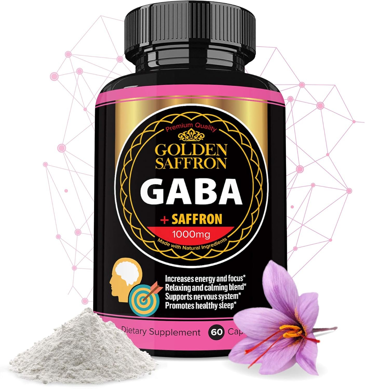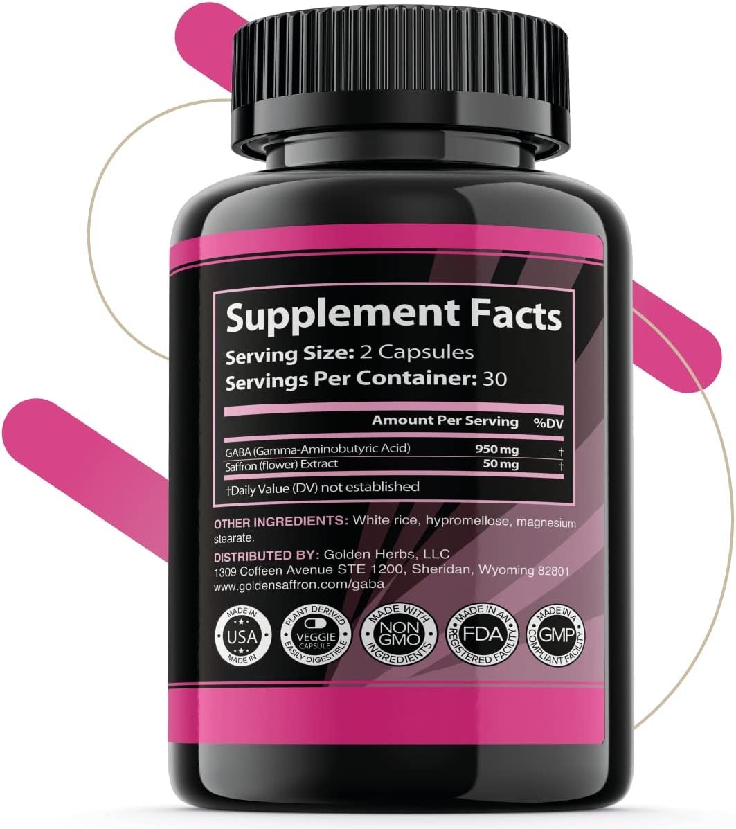Golden Saffron GABA is a supplement that contains saffron and GABA. It is designed to support healthy sleep patterns and promote relaxation. The supplement is easy to use with convenient capsules. It is made in the USA and is free of gluten, wheat, dairy, soy, yeast, and sodium. It also contains no sugar, sweeteners, preservatives, or artificial colors.