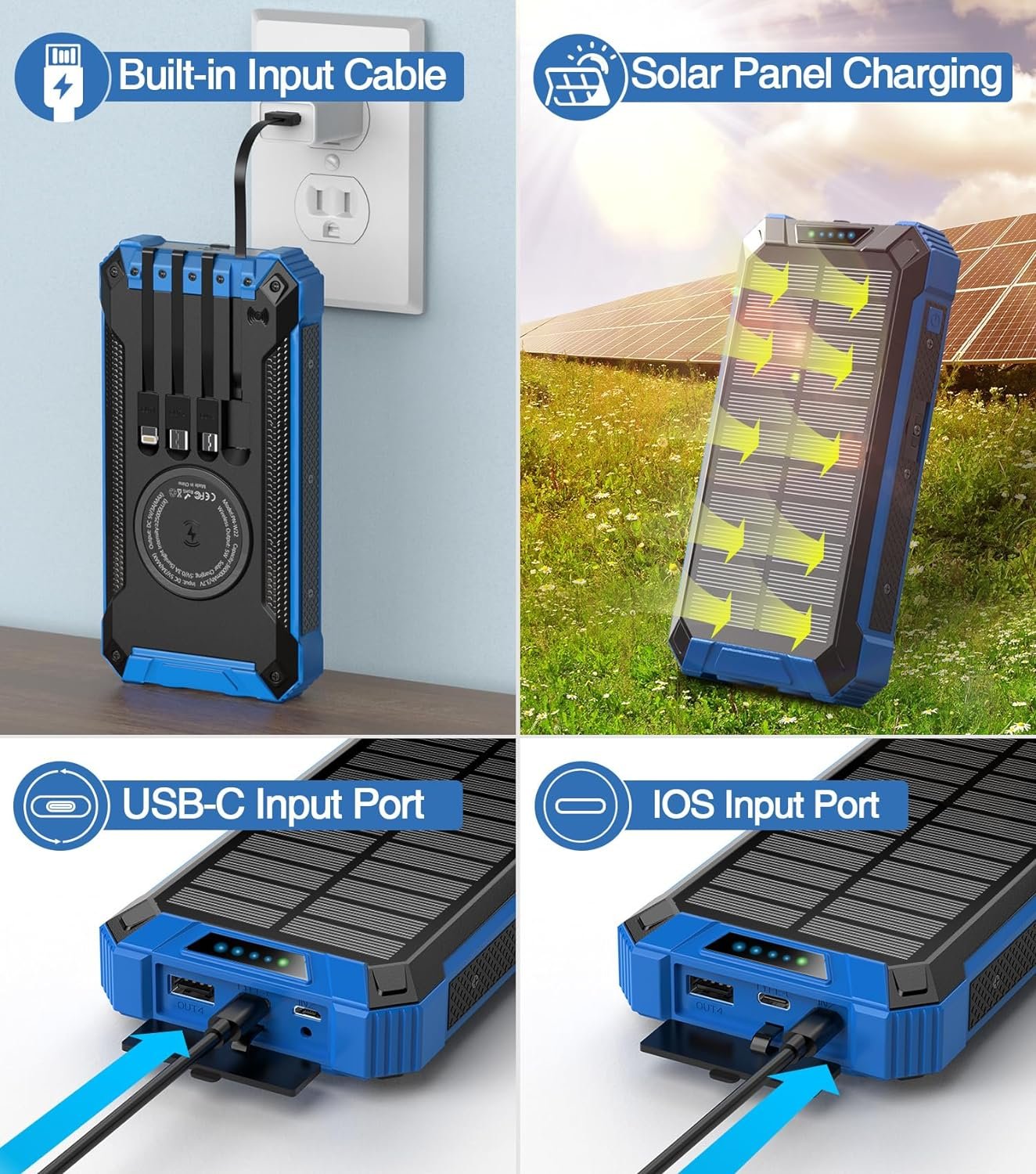 [Power 6 Devices at Once] This solar charger is also equipped with 4 ports (iOS input, USB A output, USB C input/output), providing 5V/3A high-speed charging to save time. Along with 4 charging cables and wireless charging, it supports charging 6 devices simultaneously. Keep all your devices alive. Sharing with families and friends is perfect.