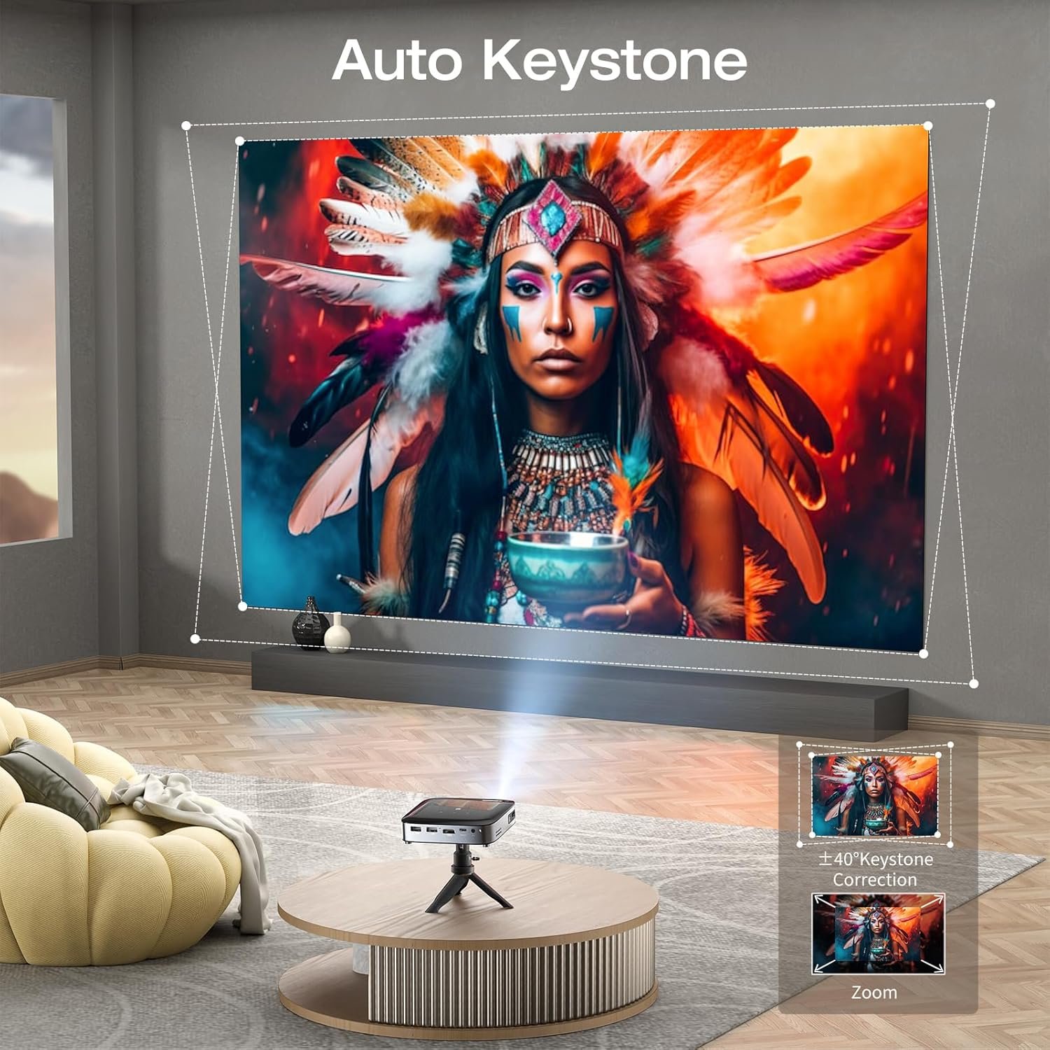 Pocket-Sized and Automatic Keystone Correction-The pico projector measures just 5.9×3.9×0.9 inches and weighs approximately 2.6 pounds, making it impressively compact and incredibly portable, which you can take it with you anywhere and at any time. This smart projector features automatic vertical ±45° keystone correction, ensuring that you never have to worry about the image appearing blurry or distorted. This feature helps to correct any discrepancies quickly and seamlessly.