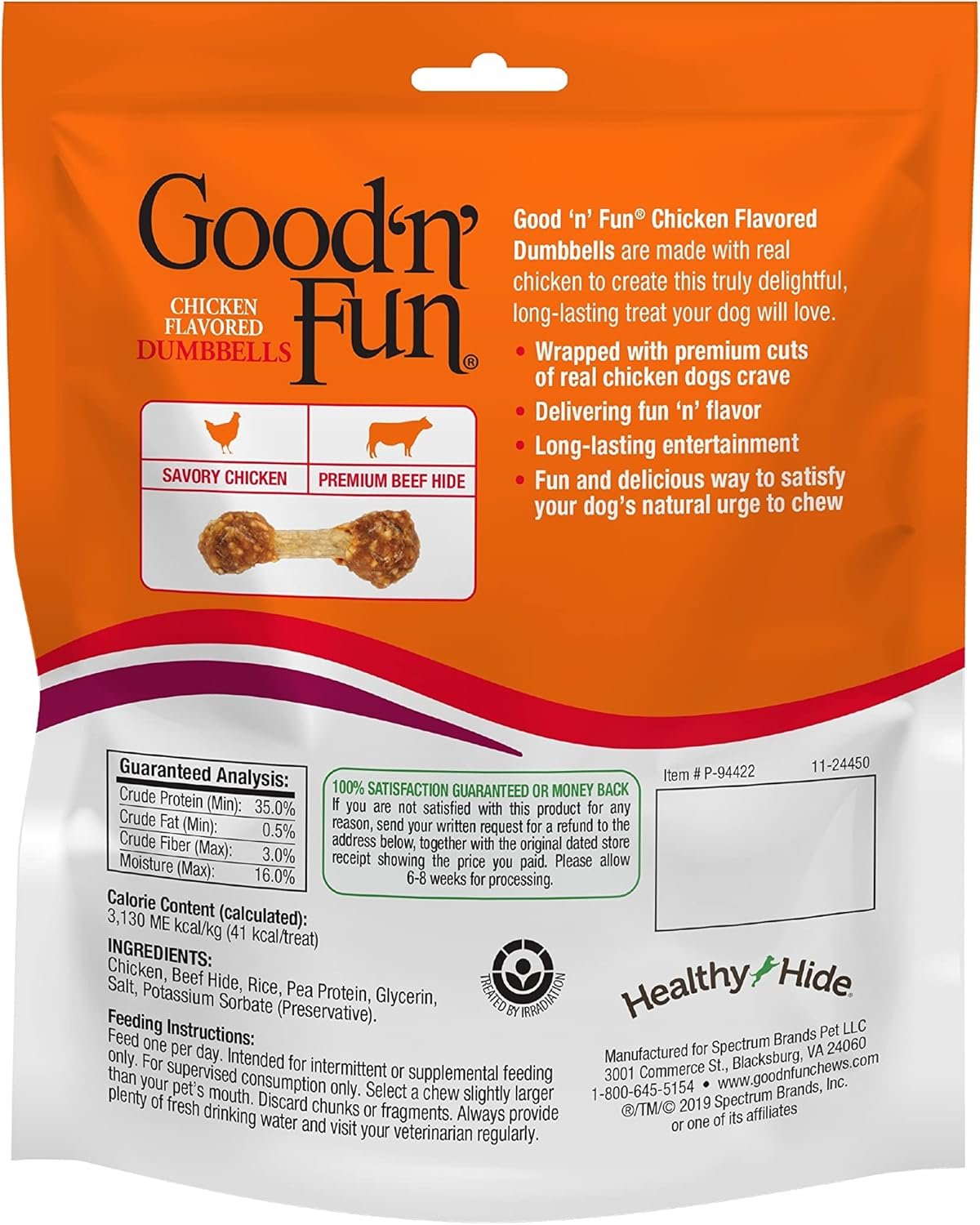 Good ‘n’ Fun® brand offers a tasty smorgasbord of flavors that dogs love. These delicious chews are made from the finest ingredients, including real chicken and real beef hide, to create truly delightful, long-lasting treats your dog will love. Wrapped with premium cuts of real chicken, these flavor-packed Good ‘n’ Fun® Chicken Flavored Dumbbells are sure to get your dog’s tail wagging. Plus, these delicious gourmet dog treats are made with beef hide to create a truly delightful, long-lasting treat. Good ‘n’ Fun Chicken Flavored Dumbbells are a fun and delicious way to satisfy your dog’s natural urge to chew. These dumbbell-shaped snacks make for long-lasting entertainment. Snack for small dogs. Feed one Good ‘n’ Fun Triple Flavor Dumbbell per day. For intermittent or supplemental feeding only, and for supervised consumption only. Select a chew slightly larger than your pet’s mouth. Discard chunks or fragments. Always provide plenty of fresh drinking water and visit your veterinarian regularly.
