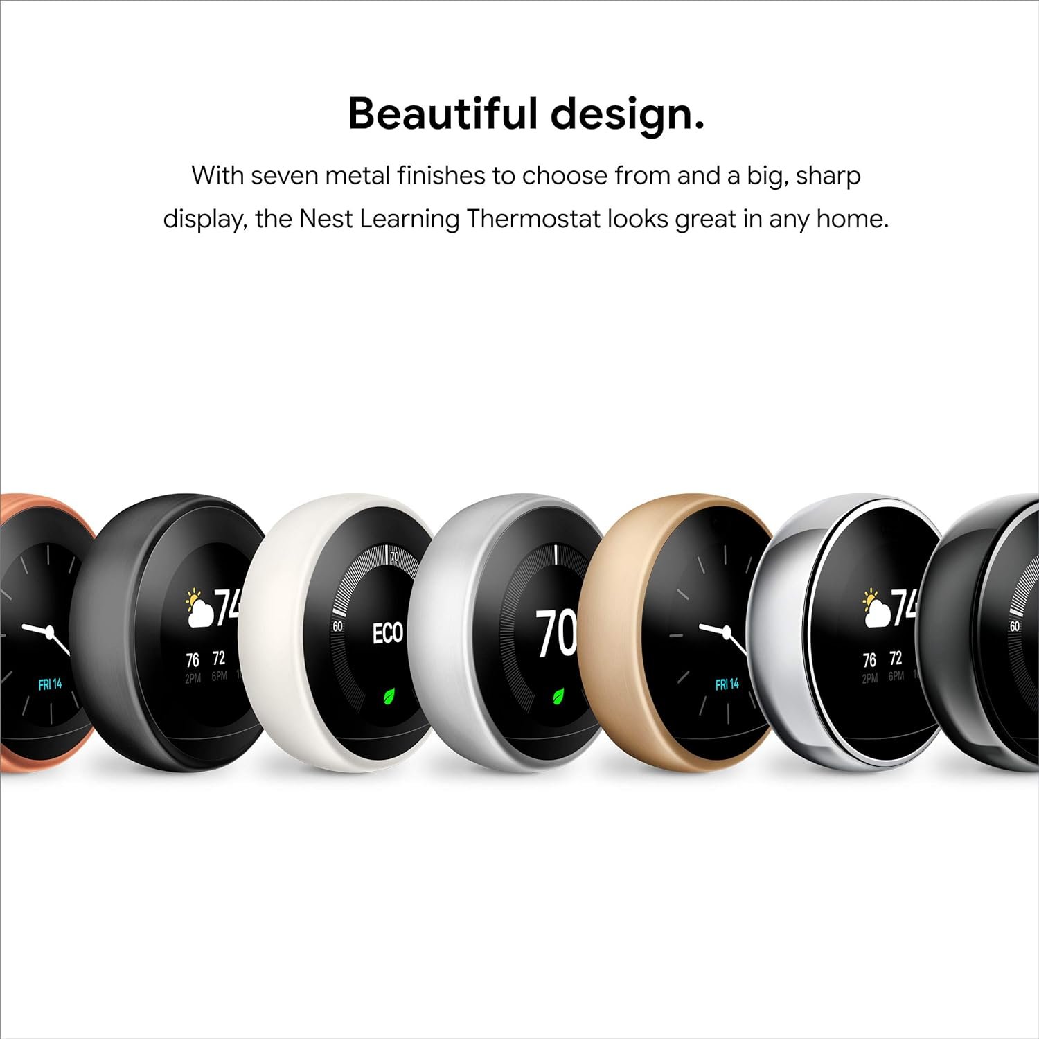The Nest Learning Thermostat is a smart thermostat that learns your schedule and programs itself to help save energy. You can control it from anywhere with the Nest app, and it works with Alexa and Google Assistant so you can adjust the temperature with your voice. And it’s beautifully designed, with a big, bright display and metal finishes to suit any home’s style. This Google Product features the Google Seal for Online Marketplace when purchased from a seller other than Amazon.com. [1] Remote control and mobile notifications require working internet and Wi-Fi. [2] Alerts can notify you of a potential issue with eligible HVAC systems. They’re meant to provide helpful information, not an endorsement, representation, or warranty of any kind about the health of your HVAC system. Alerts aren’t intended to replace a diagnosis by a qualified HVAC professional. [3] Energy savings are not guaranteed and depend on energy usage, weather, and other factors. [4] Voice control requires a compatible device, and working internet and Wi-Fi.