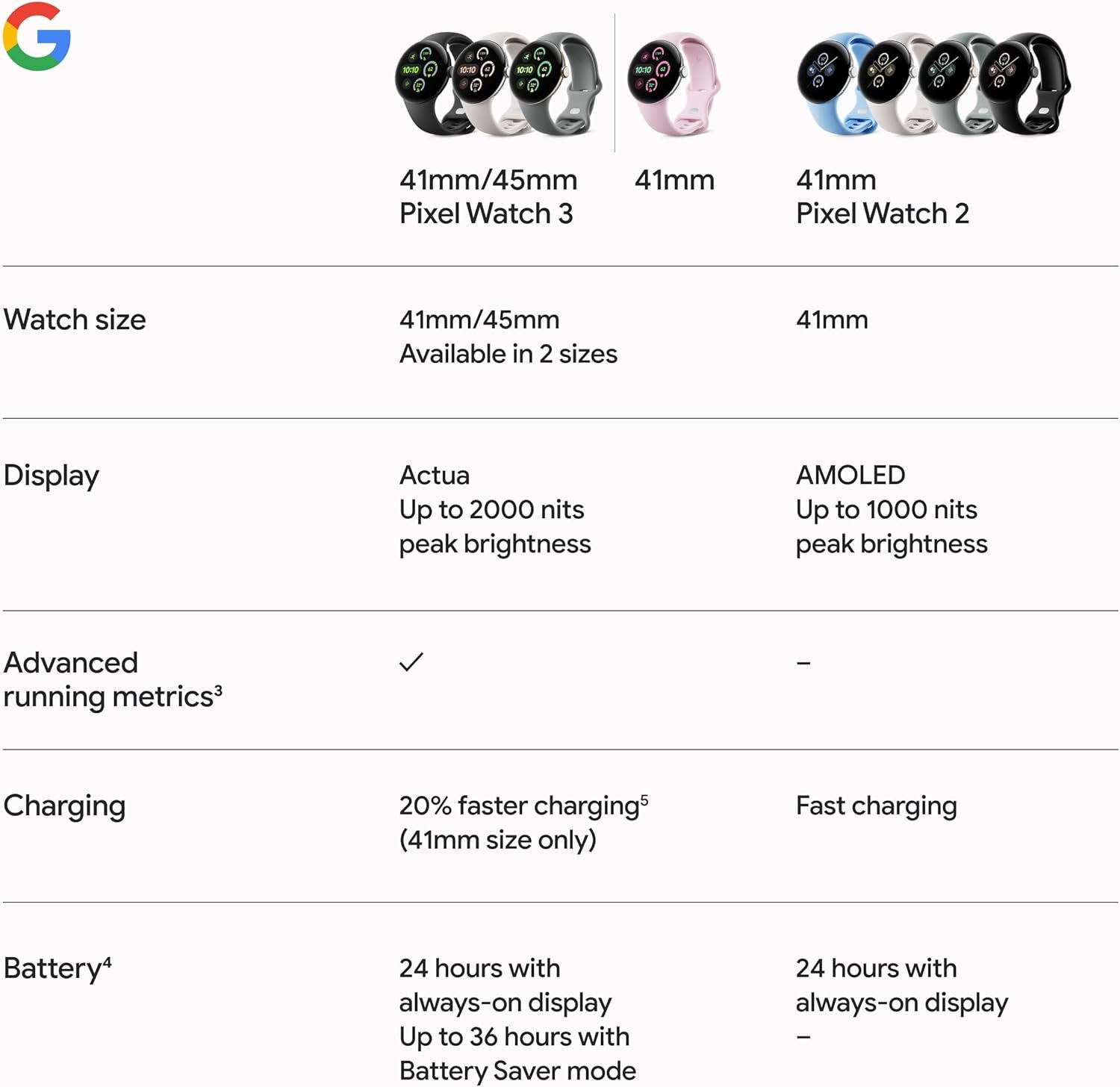 The Google Pixel Watch 3 is designed for performance, with advanced fitness from Fitbit[1,2]; the 41mm screen is twice as bright and 10% larger than before, making it easier to see your stats and info[1]