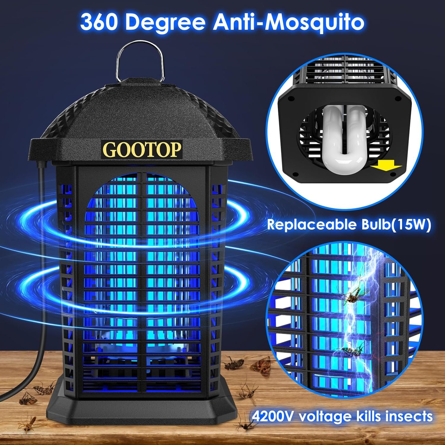 GOOTOP bug zapper uses physical methods to control flying insects. It keeps your family and pets safe from pesticides, attractants and sprays.
