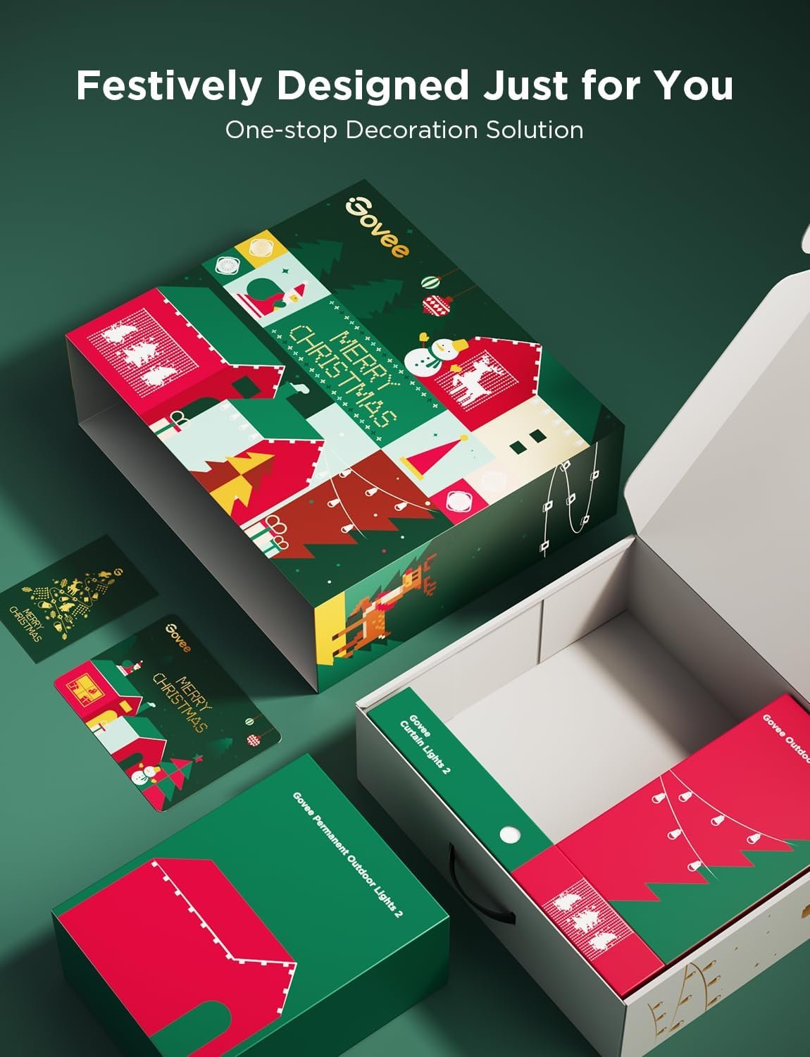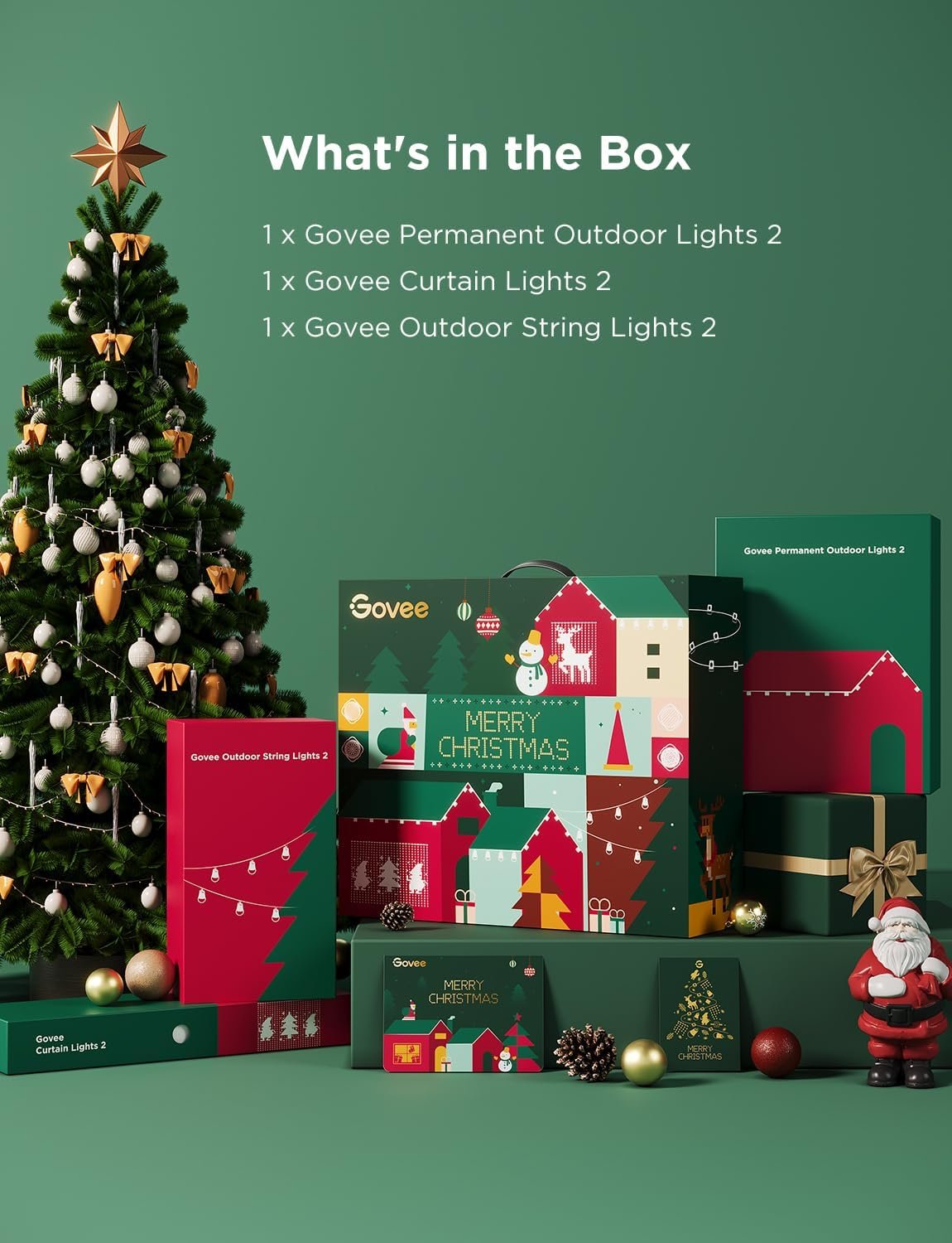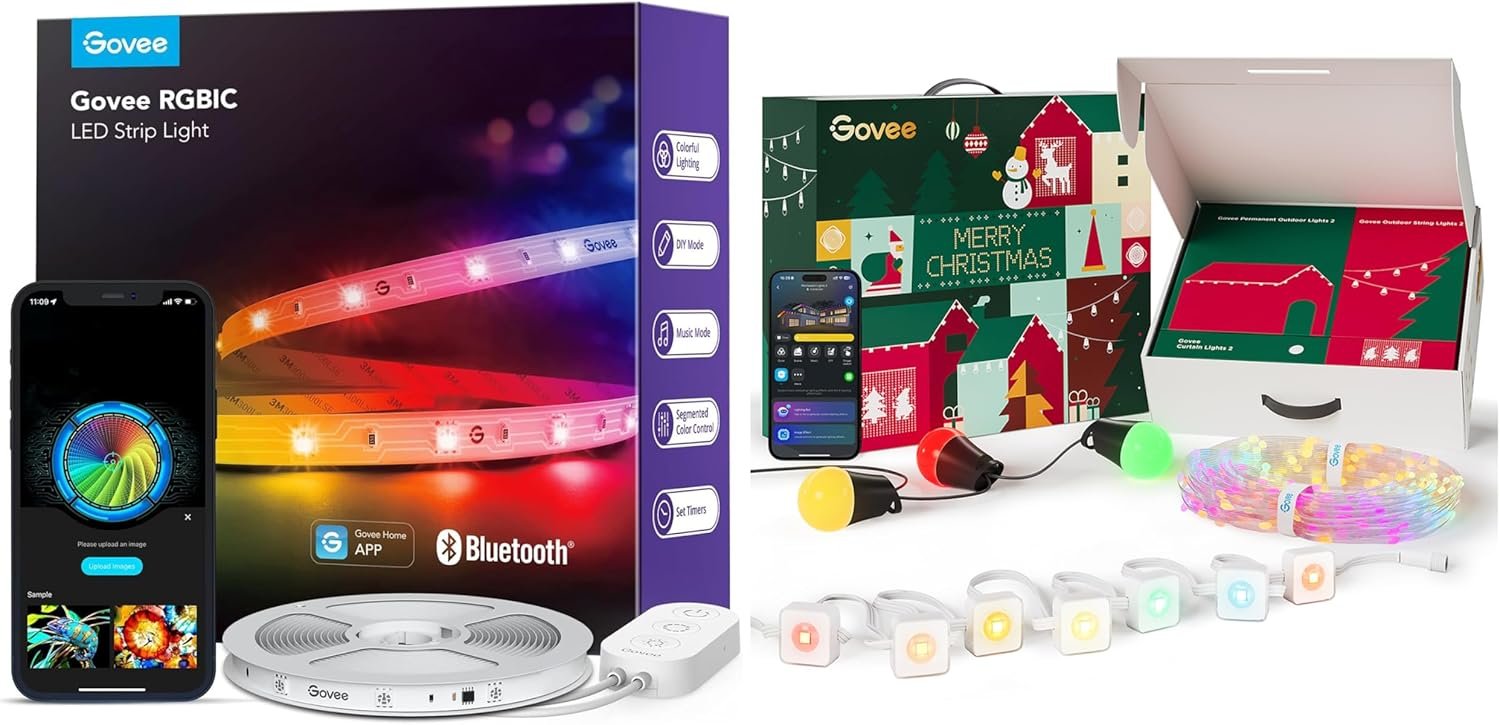 Christmas Lights: This Govee outdoor light set includes permanent outdoor lights H705E, outdoor string lights H7038, and curtain lights H70B3. Personalize your ambiance with this Santa’s Beacon Bundle.