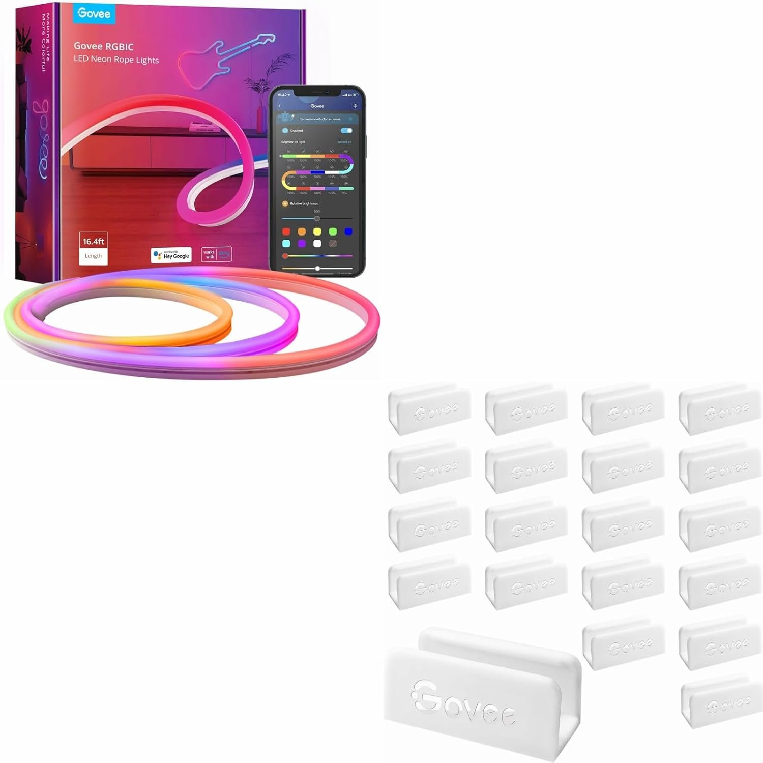Govee RGBIC Neon Rope Light, 16.4ft LED Strip Lights, Music Sync Bundle with Govee RGBIC Neon Rope Light Mounting Brackets H1000