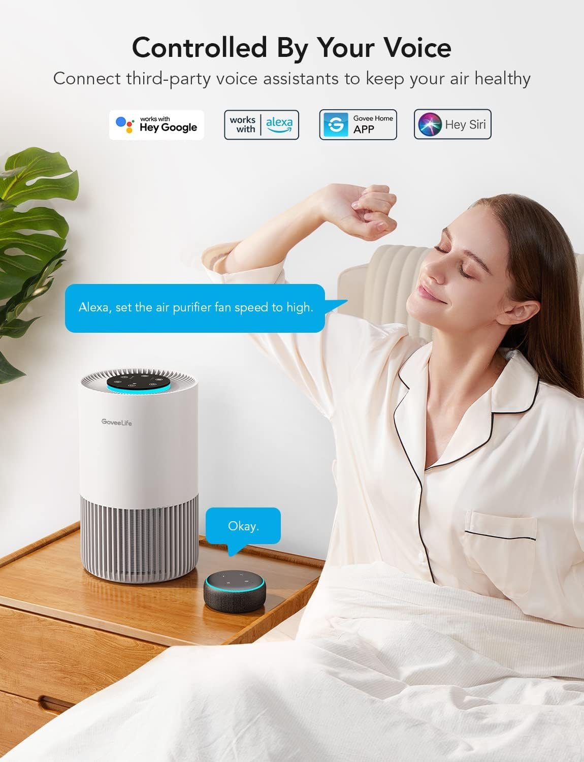 Smart Control: GoveeLife Air Purifier can connect with GoveeHome App via Wi-Fi and Bluetooth for easy command of fan speeds, timers, RGB night light, sleep mode, and more. It can also be paired with Alexa, Google Assistant, and IFTTT.