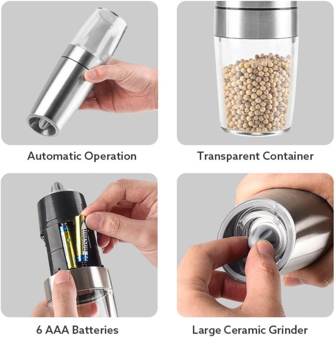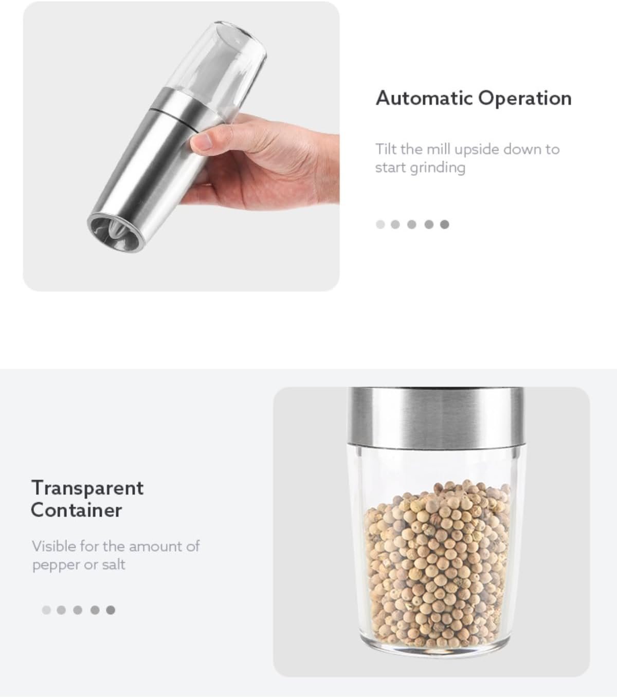 1. Automatic and Convenient: With just a simple tilt of the grinder, the gravity electric system automatically grinds and dispenses salt and pepper, making seasoning your dishes effortless and efficient.