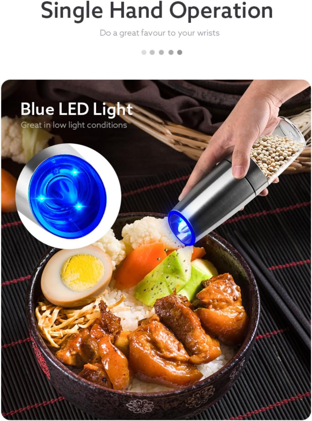 2. LED Light for Precision: The built-in LED light ensures accurate seasoning even in dimly lit environments, allowing you to easily monitor the amount and distribution of salt and pepper on your food.