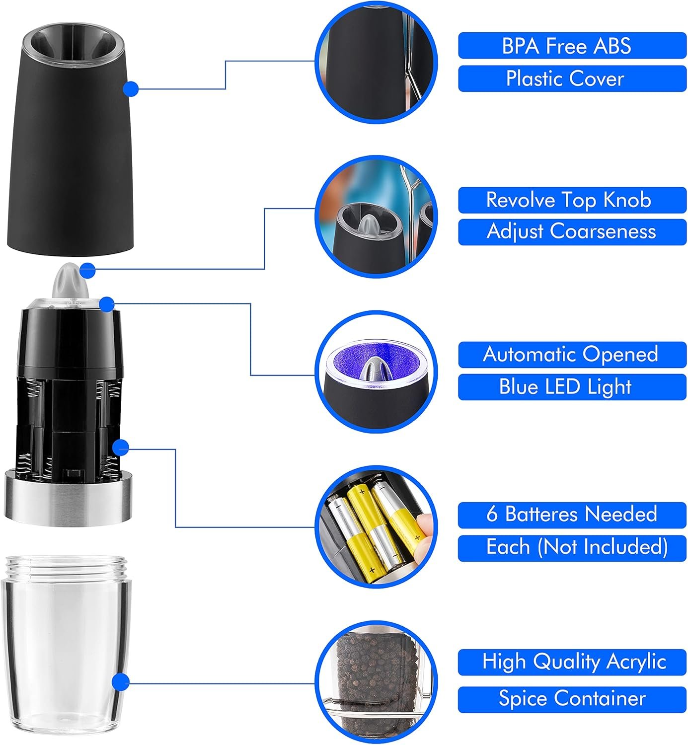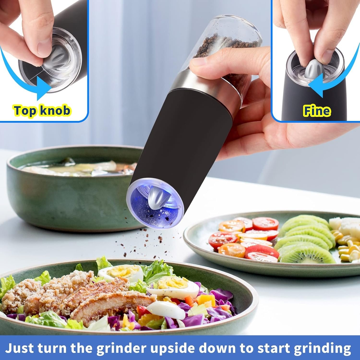 Gravity Electric Pepper and Salt Grinder Set, Battery Operated Pepper Mill with Blue LED Light, One Hand Operation, Flip to Grind, Adjustable Coarseness