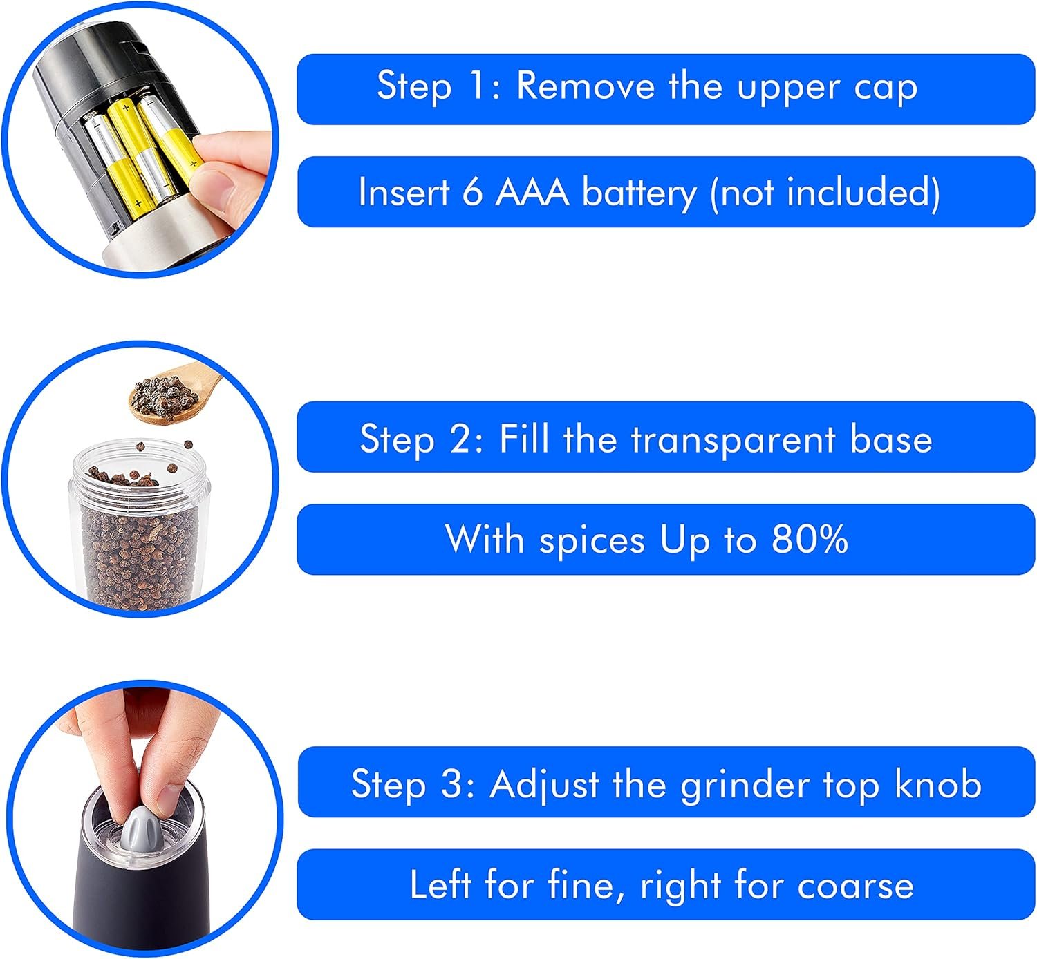 ADJUSTABLE COARSENESS — By simply adjusting the top knob, you can change the coarseness of the grinding. Fine or coarse, your preferences are easily met. Himalayan salt, pepper, spices, or sea-salt: choose your preferred coarseness.
