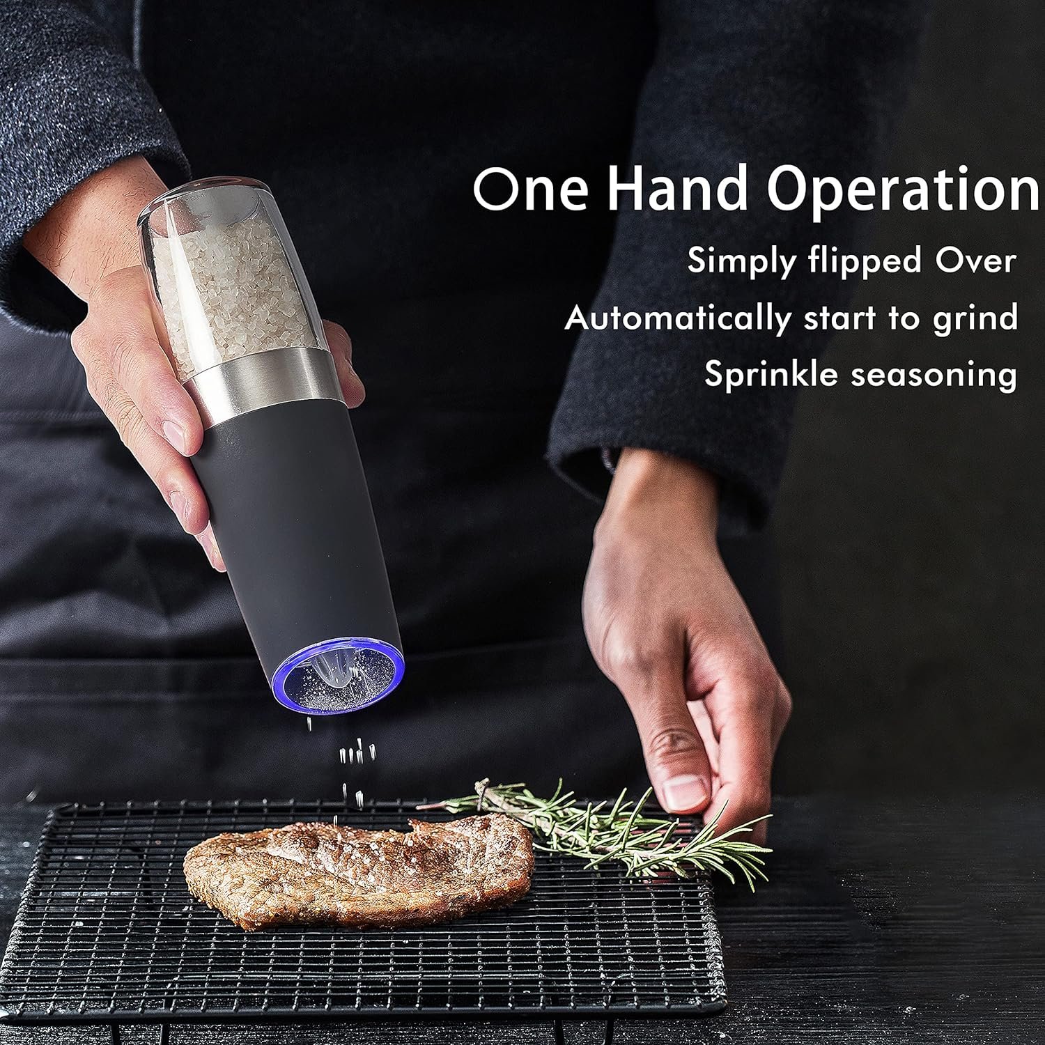 FLIP TO GRIND — Simply flip over the grinder to automatically start the grinding of your salt or pepper. Unique design, no buttons to press, no shaking or twisting required. Easy one-handed use.